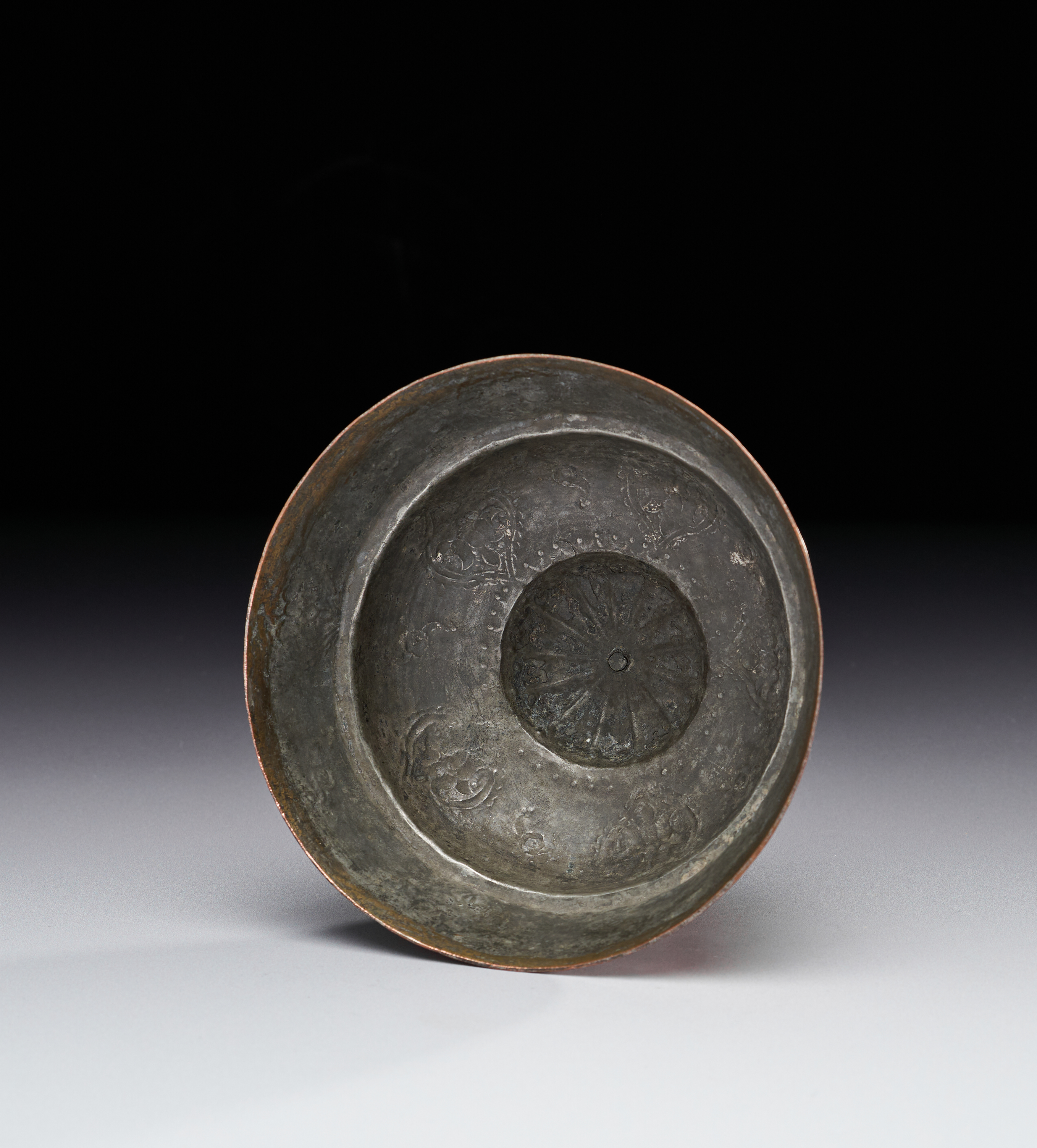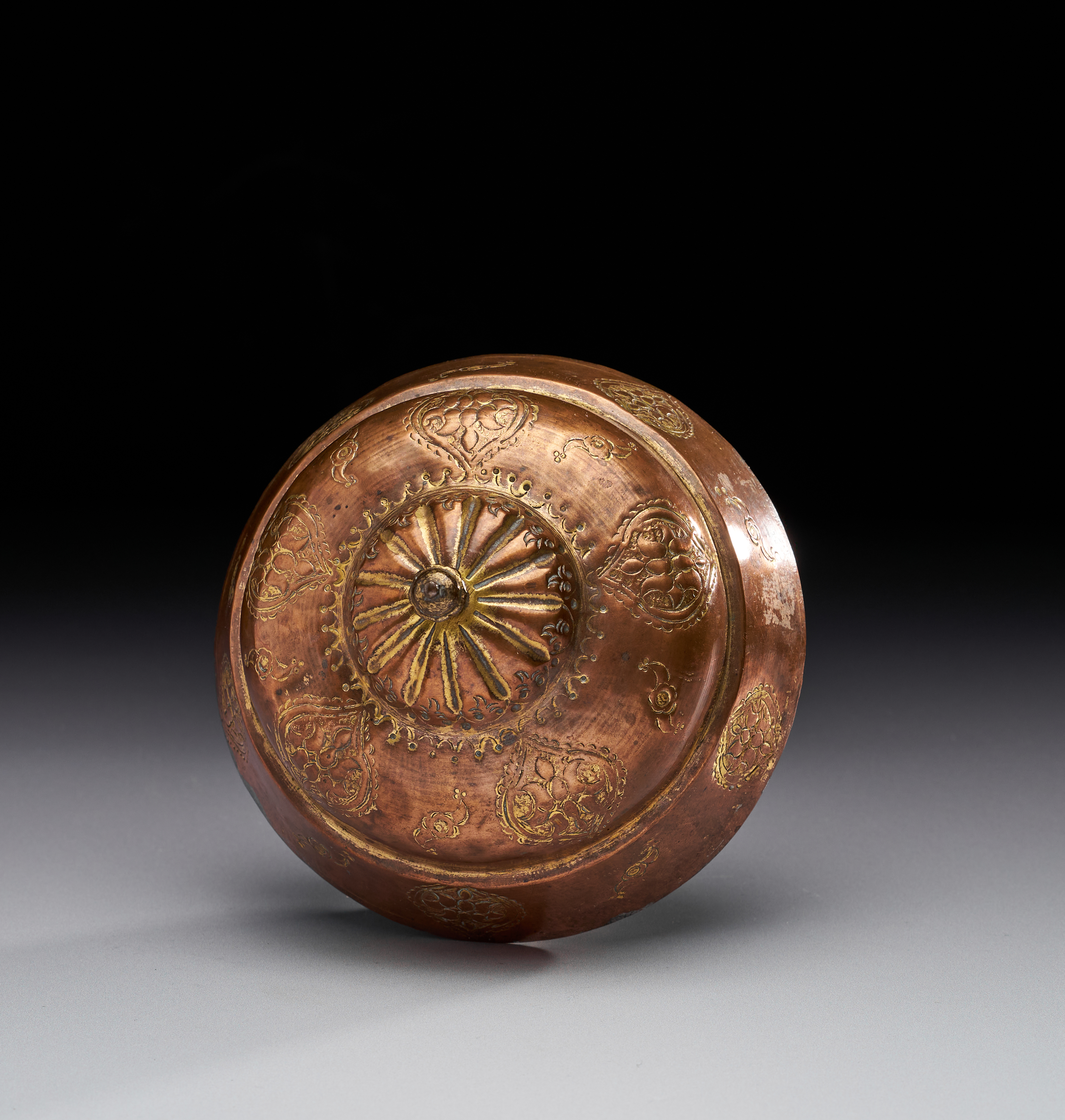 Of domed circular form with a central bud finial, the lid is worked in copper richly gilt (tombak), its surface decorated with repoussé and chased motifs. The crown displays a radiating sunburst rosette within a band of delicate scrolls, while the sloping sides are adorned with alternating arabesque cartouches and paired cloud-scroll motifs in gilt, each highlighted against the warm copper ground. The upper dome is further punctuated with small pierced elements around the base of the finial, enhancing its play of light and shadow.