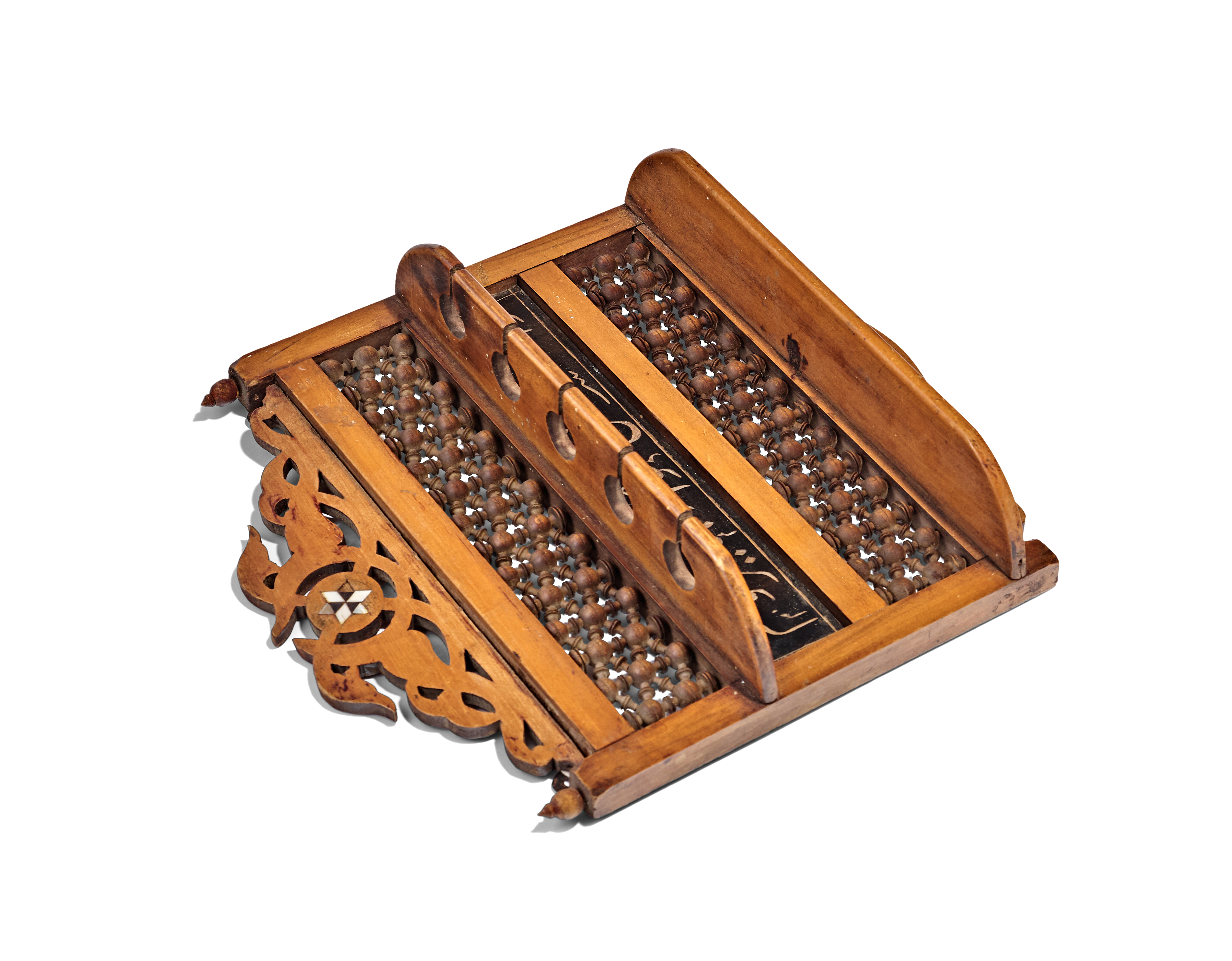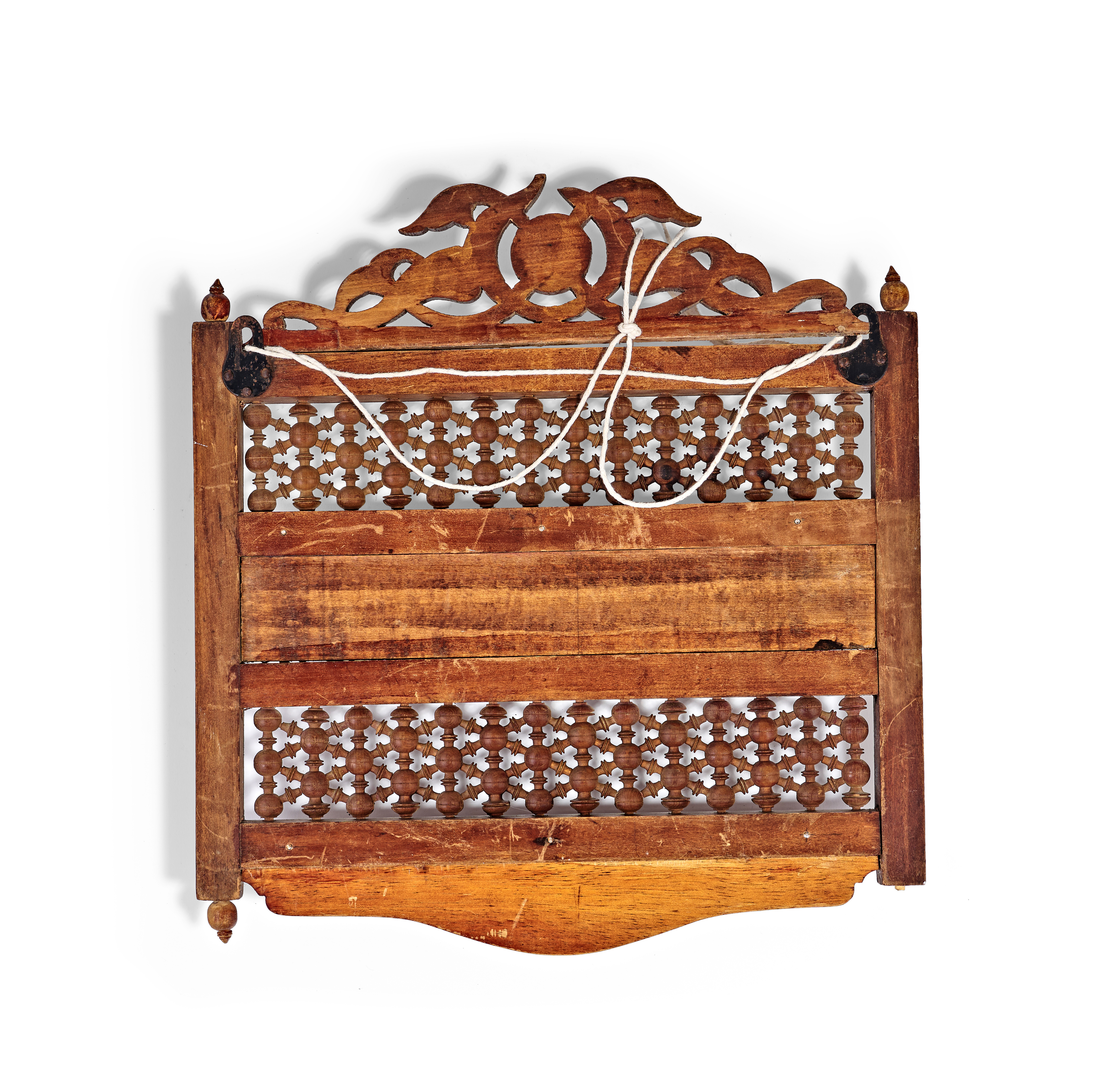 This Ottoman pipe rack is constructed from carved wood and features a pierced pediment centered by a geometric mother-of-pearl inlay. The rectangular frame contains two tiers of turned mashrabiya lattice-work separated by a central horizontal panel. This panel bears a line of Arabic calligraphy in light pigment against a dark ground, translating approximately as And heal the heart with what it desires. The rack is designed with two narrow shelves, the upper of which is pierced with four notched circular apertures for the storage of smoking pipes. The frame is further detailed with turned finials at the corners and a shaped lower apron. The reverse side retains metal mounting hardware and a cord for wall suspension.
