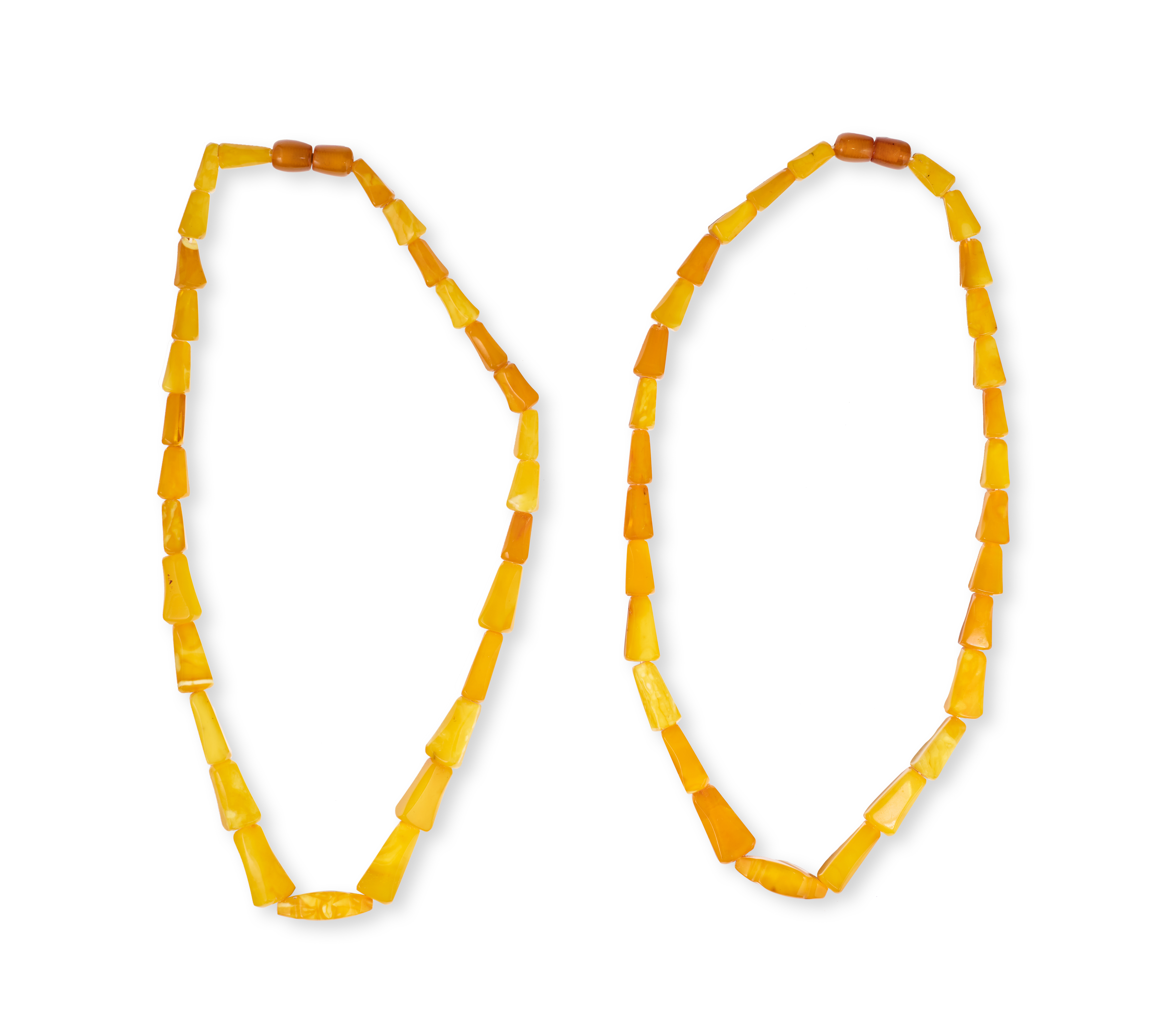 A pair of necklaces featuring graduated, block-shaped beads of natural Baltic amber attributed to Torvela. The beads are rectangular with softened edges and exhibit a matte yellow, butterscotch, and honey-colored appearance. The material displays varying degrees of opacity and natural swirling characteristic of genuine amber. Each necklace is constructed with a color-matched screw-type barrel clasp.