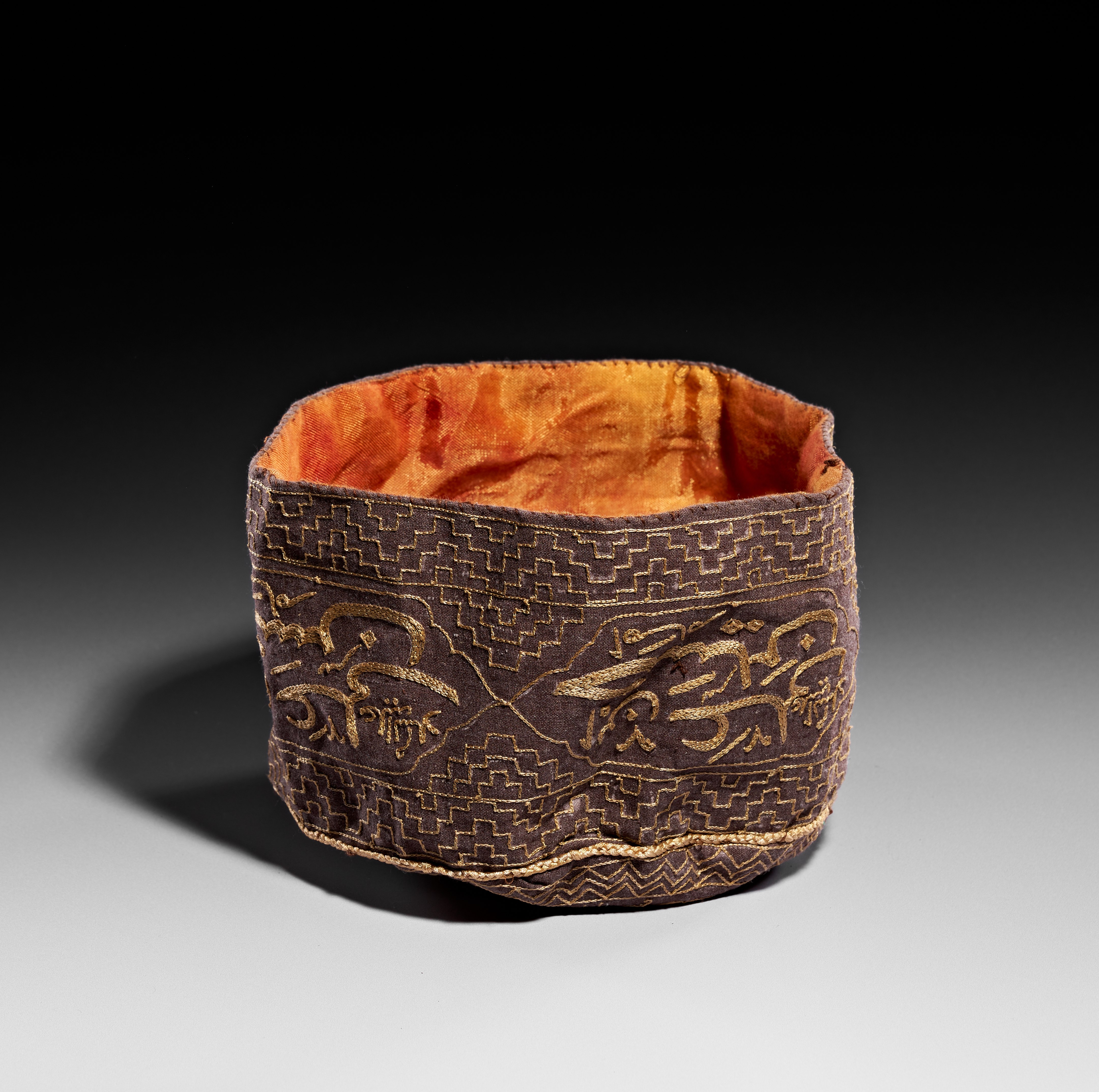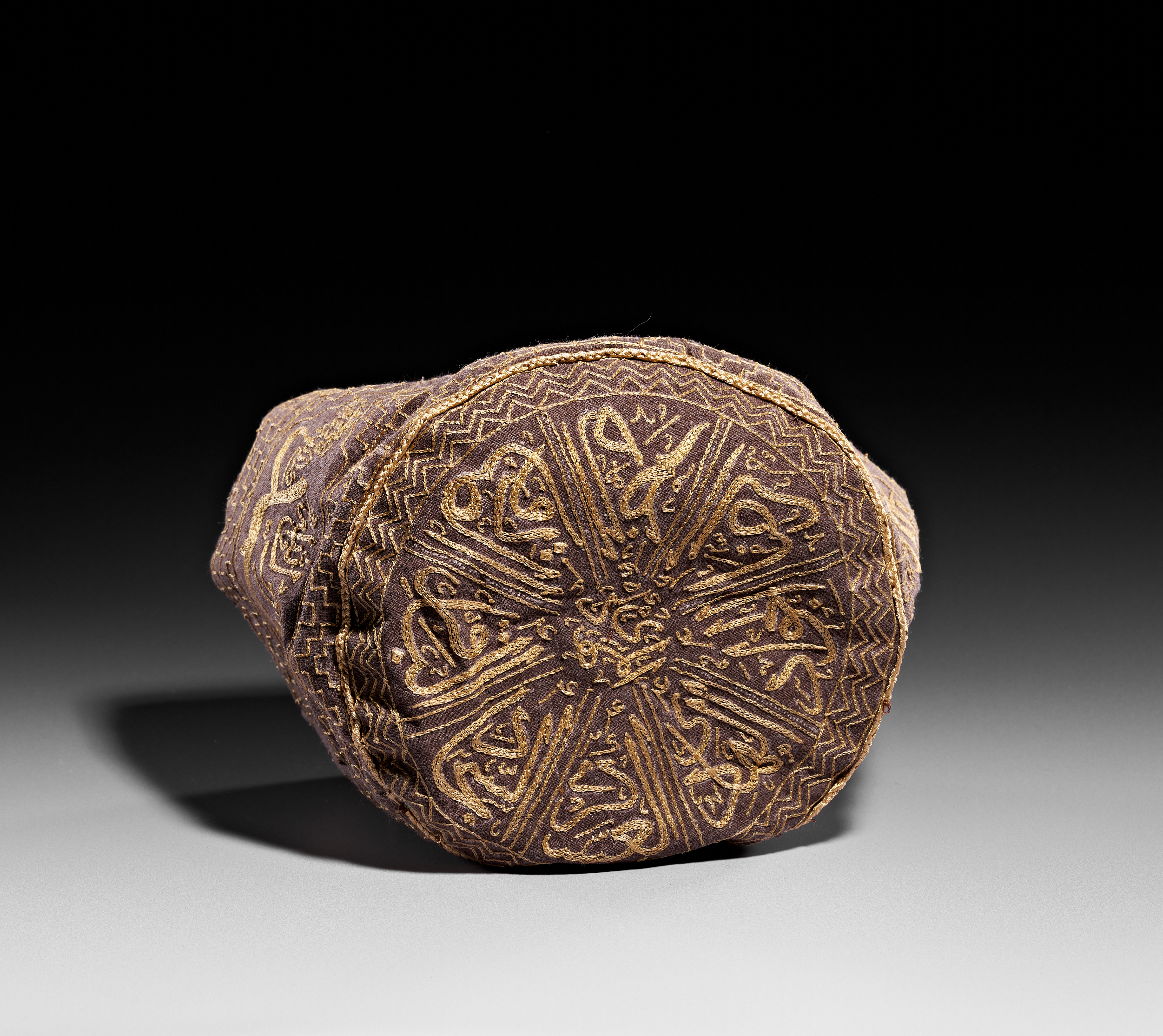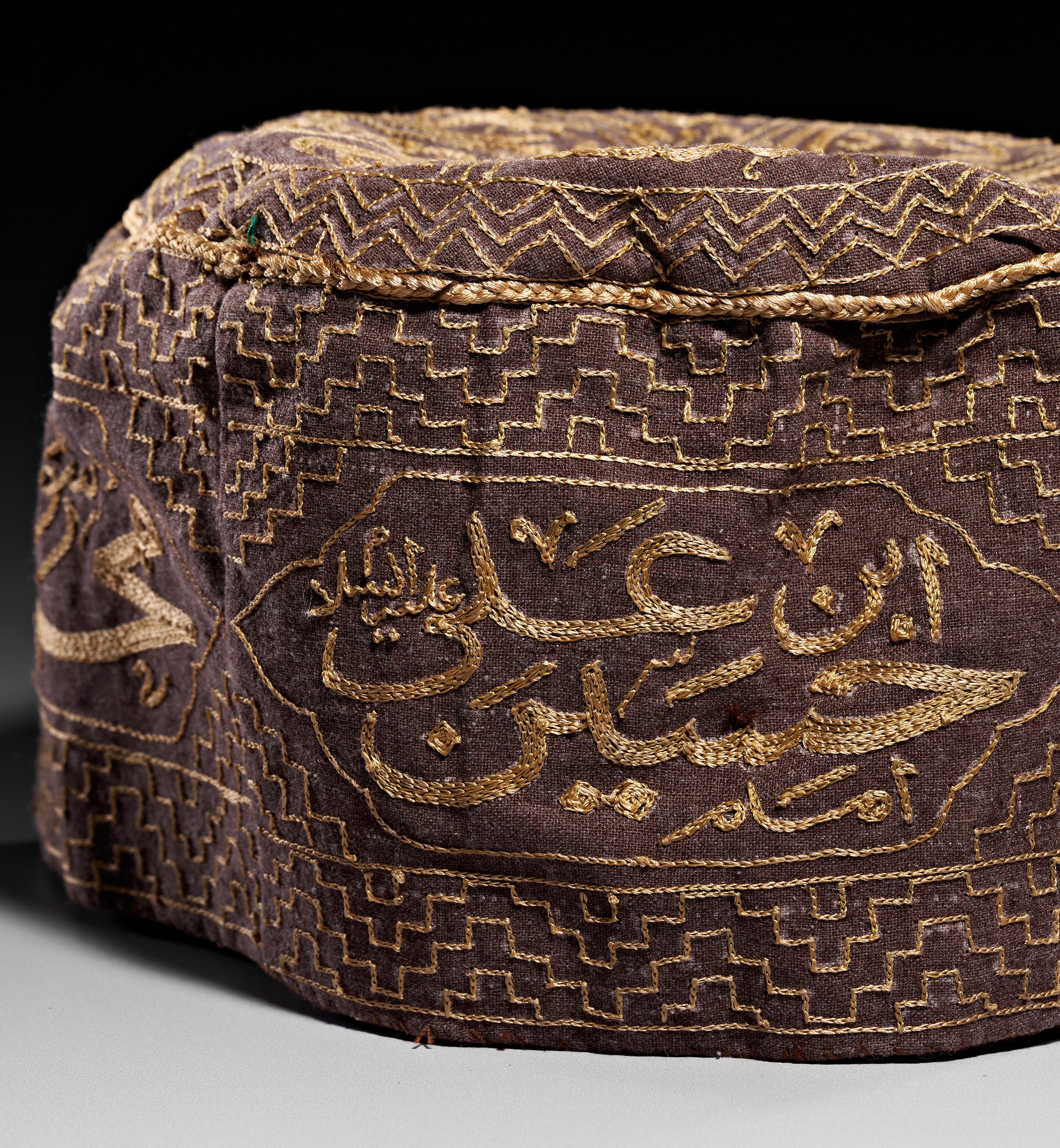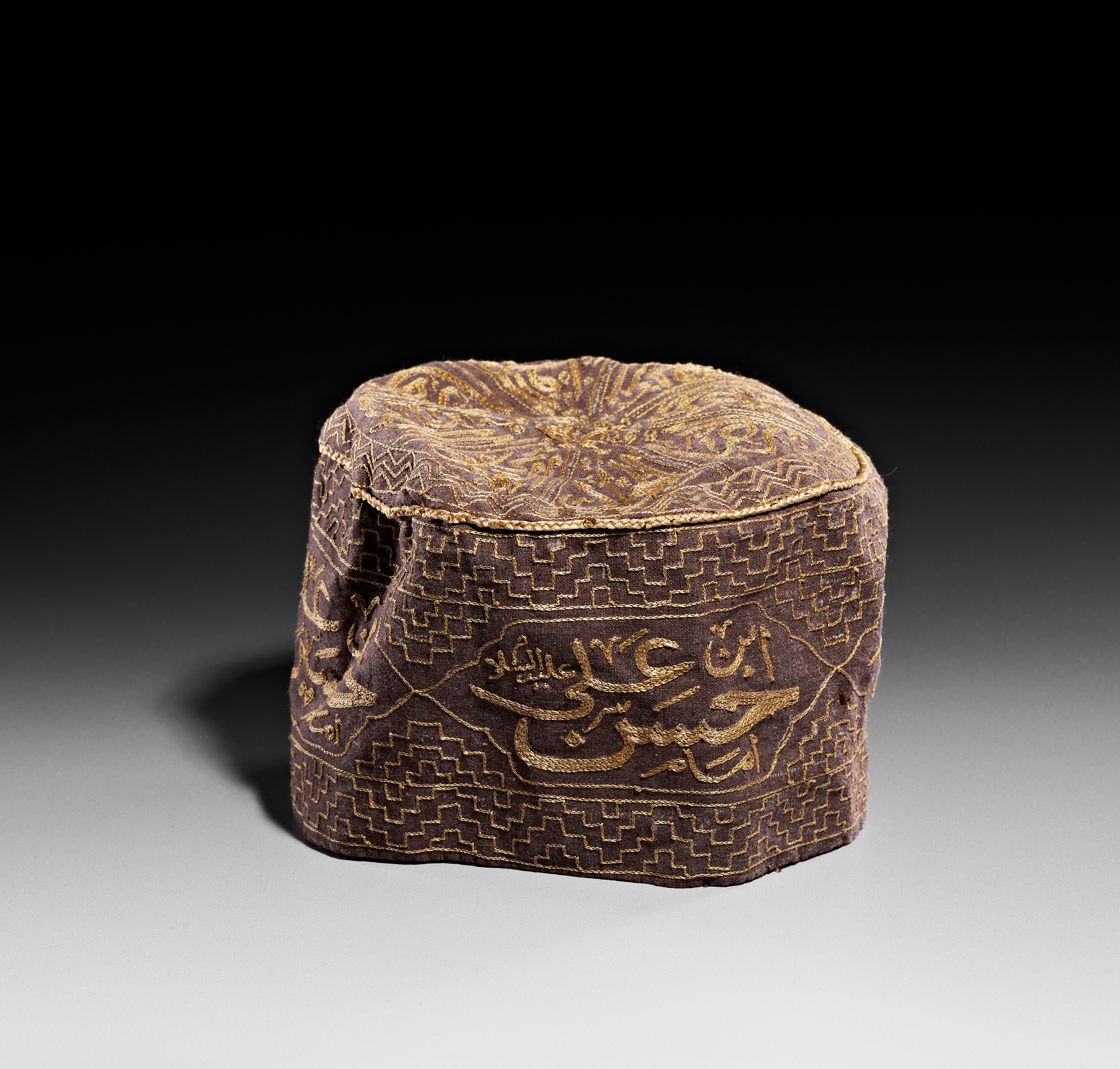 This embroidered textile skullcap, identified as a dervish hat, is composed of a dark brown base fabric embellished with gold-toned threadwork. The crown features a radial arrangement of calligraphic motifs, while the side panel is decorated with lobed medallions containing Arabic inscriptions, including references to Imam Husayn (ابن علي حسين امام). These medallions are set against a dense background of geometric step-pattern embroidery. A braided cord finishes the upper perimeter of the side wall. The interior is lined with an orange-gold fabric.