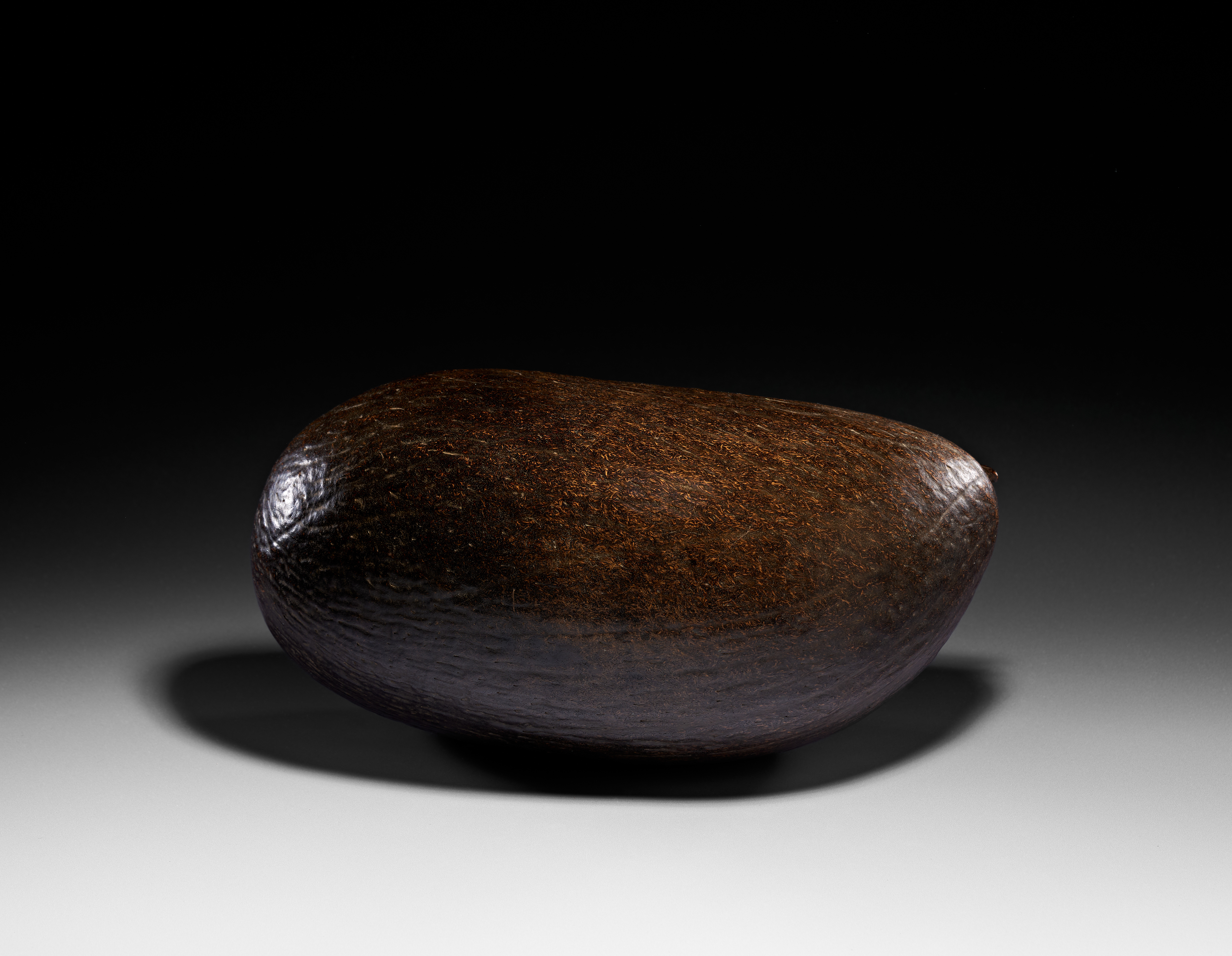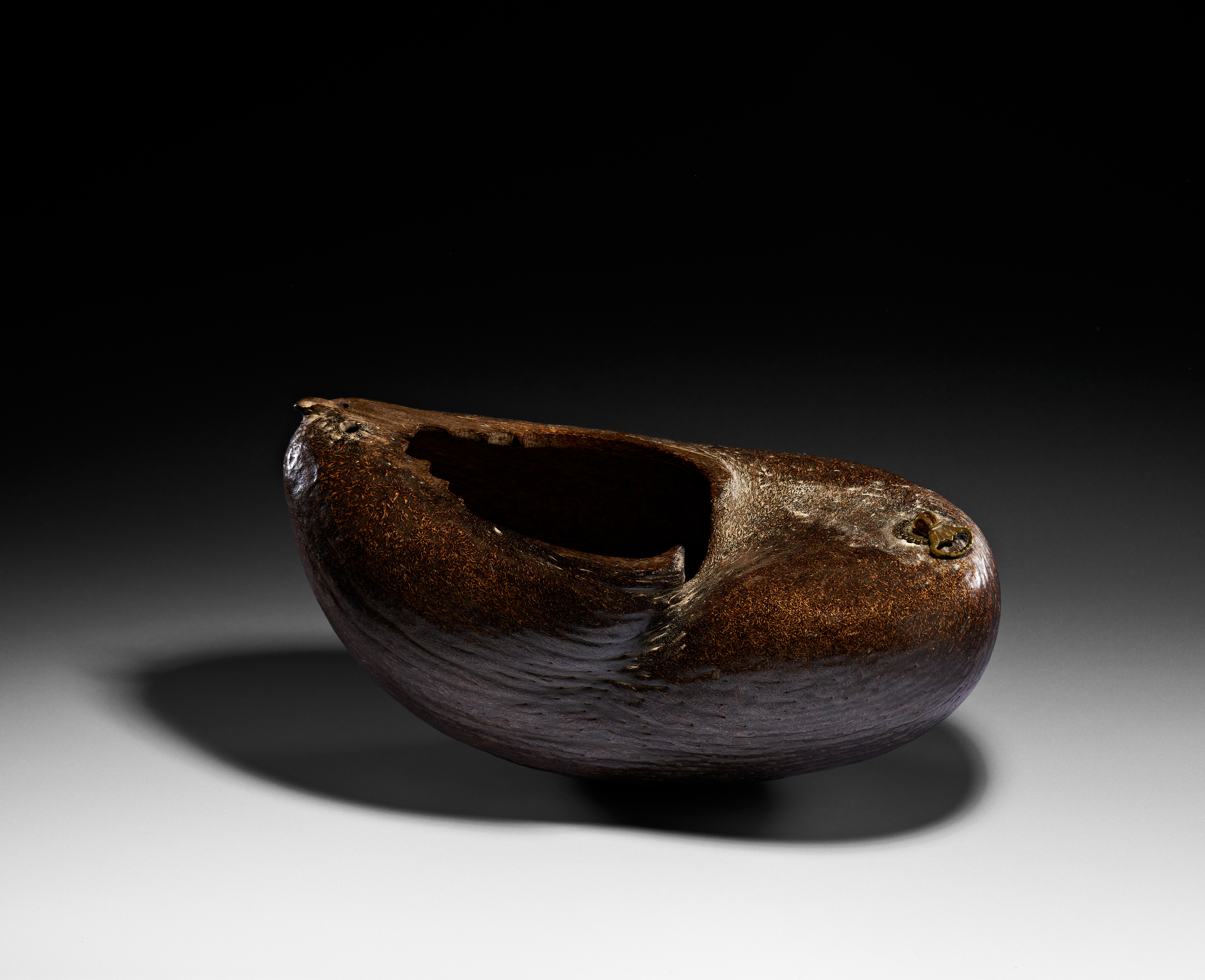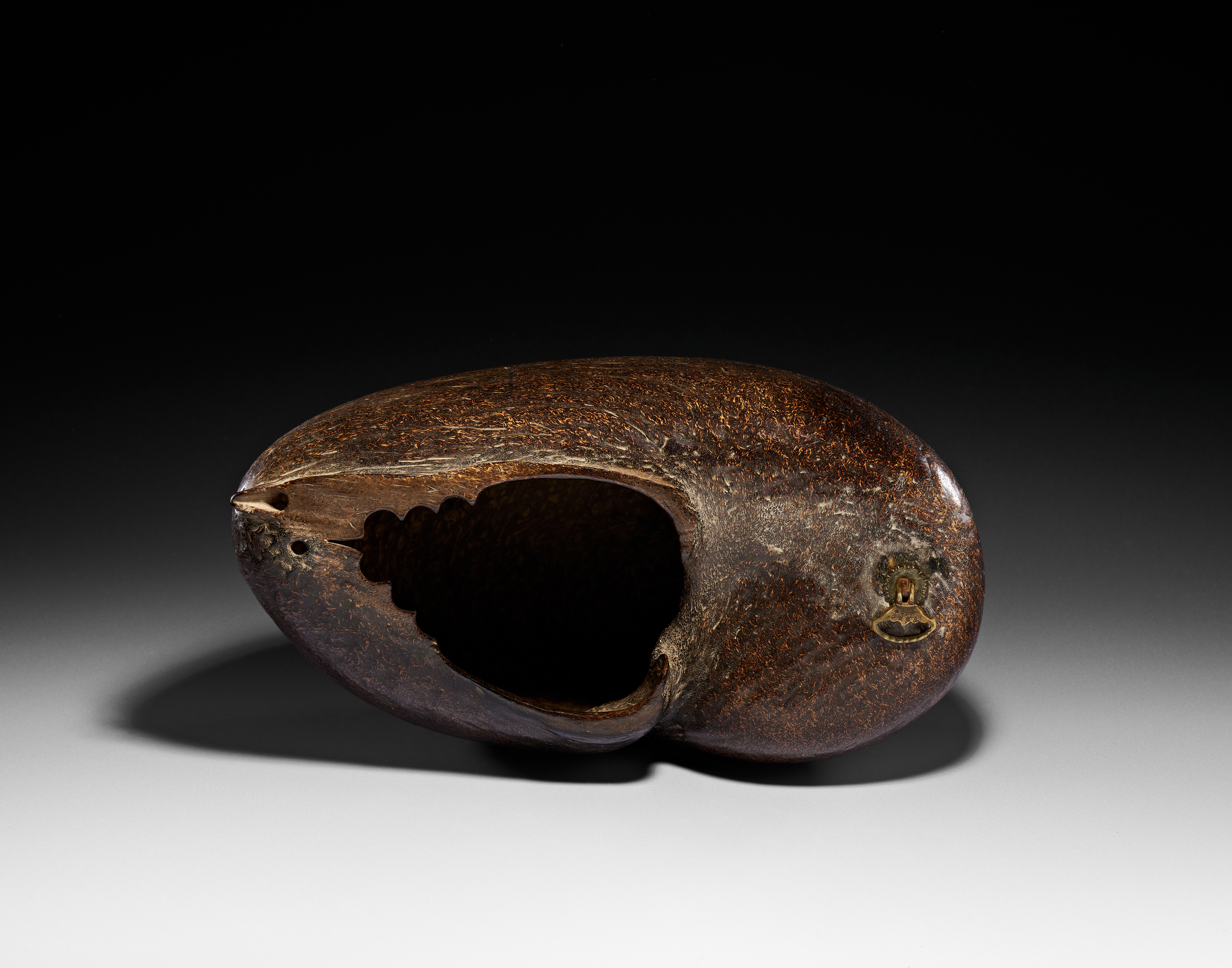 A Qajar coco-de-mer beggar’s bowl, or kashkul, from 19th-century Iran. This vessel is fashioned from a polished coco de mer (Lodoicea maldivica) shell, featuring a deep brown, lustrous finish and a characteristic fine-grained, fibrous surface texture. A large opening with a scalloped edge is cut into the upper surface to form the bowl. The shell is fitted at one end with a hinged brass ring and a circular mounting plate, designed for a carrying chain.
