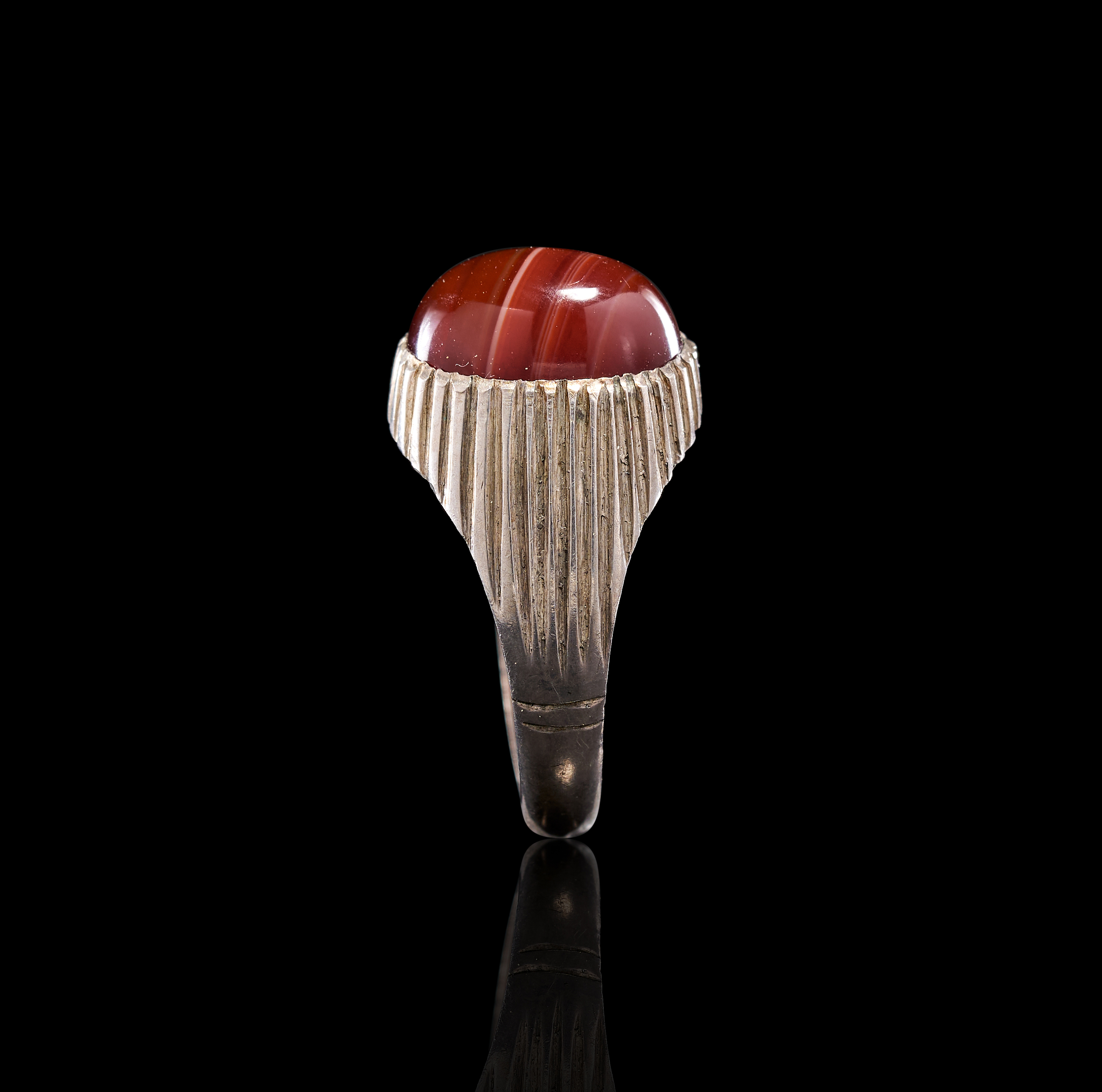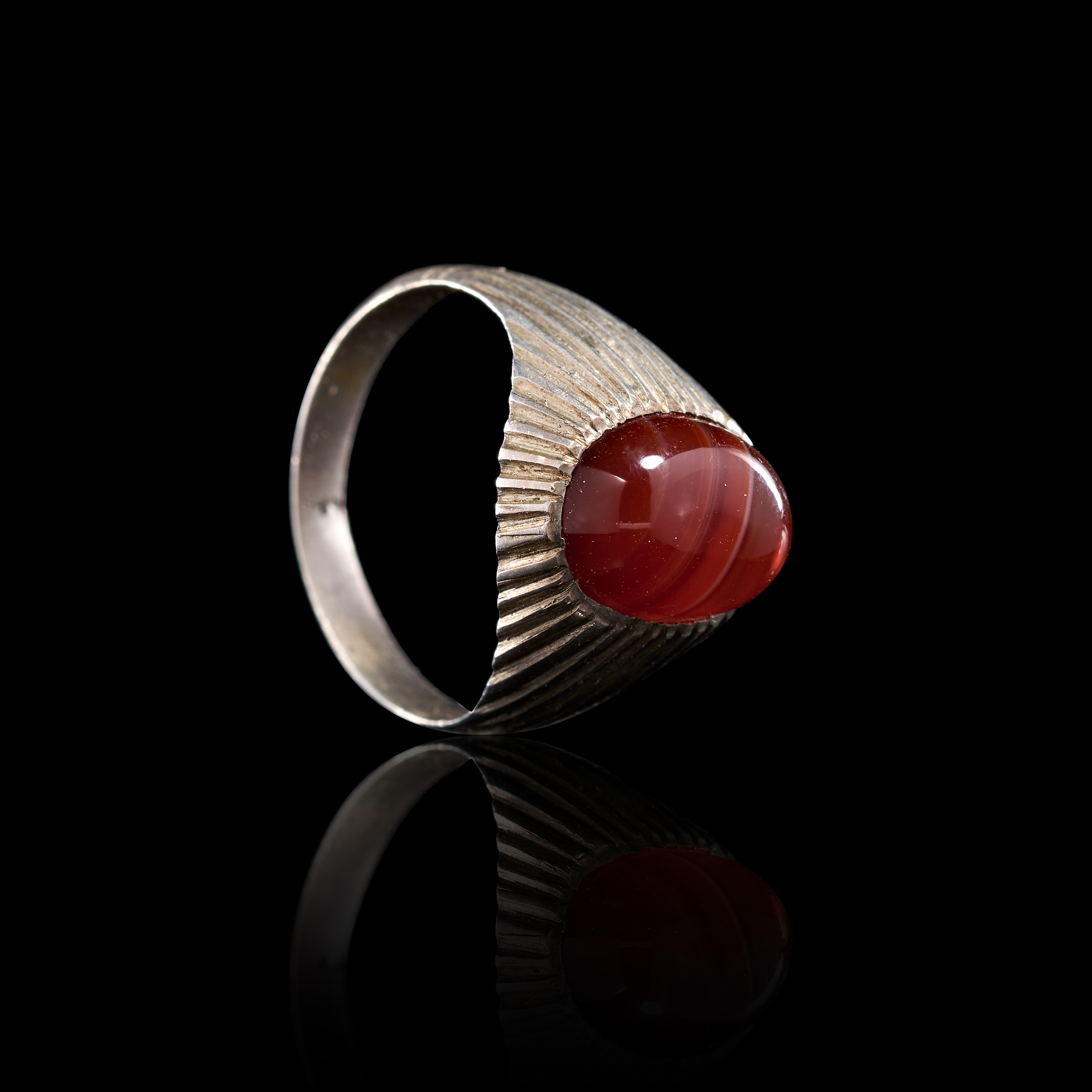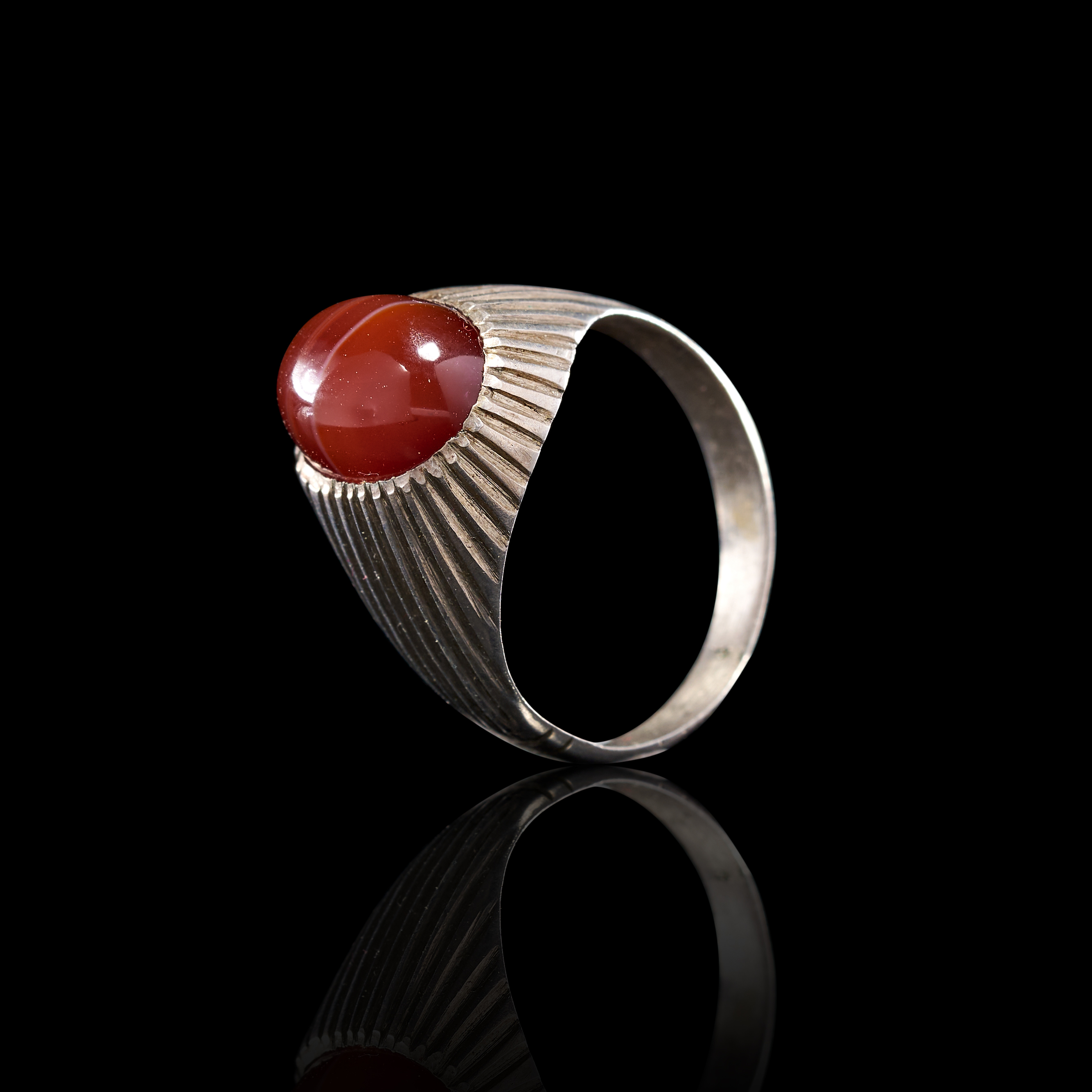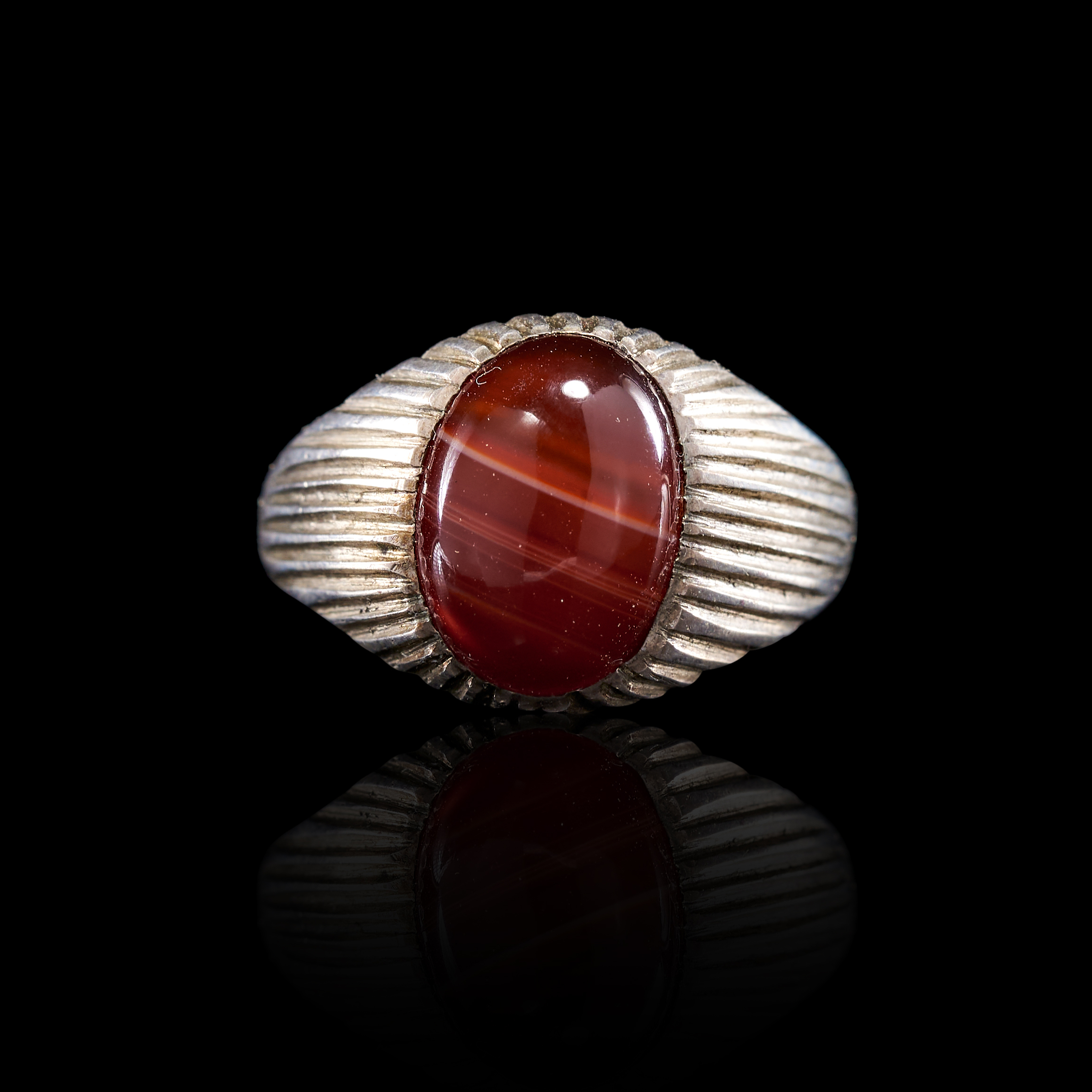 A Yemeni red aqeeq agate men’s ring featuring a large, oval, reddish-brown banded cabochon stone. The stone is set within a sterling silver mounting that displays a prominent fluted or ribbed texture radiating from the bezel across the shoulders of the band. The construction features a tapered band with a polished interior. No visible hallmarks, maker’s marks, or inscriptions are present on the interior or exterior of the piece.