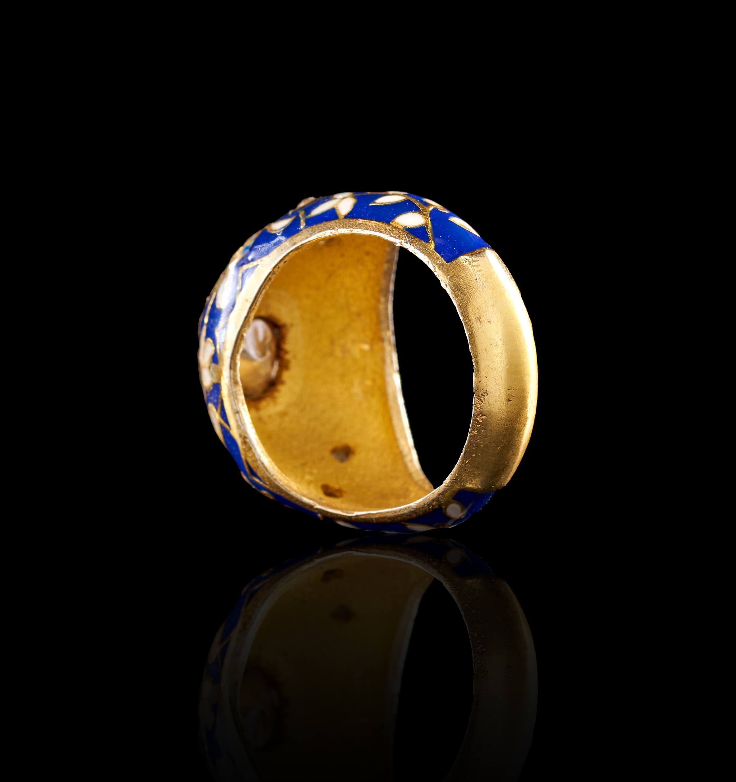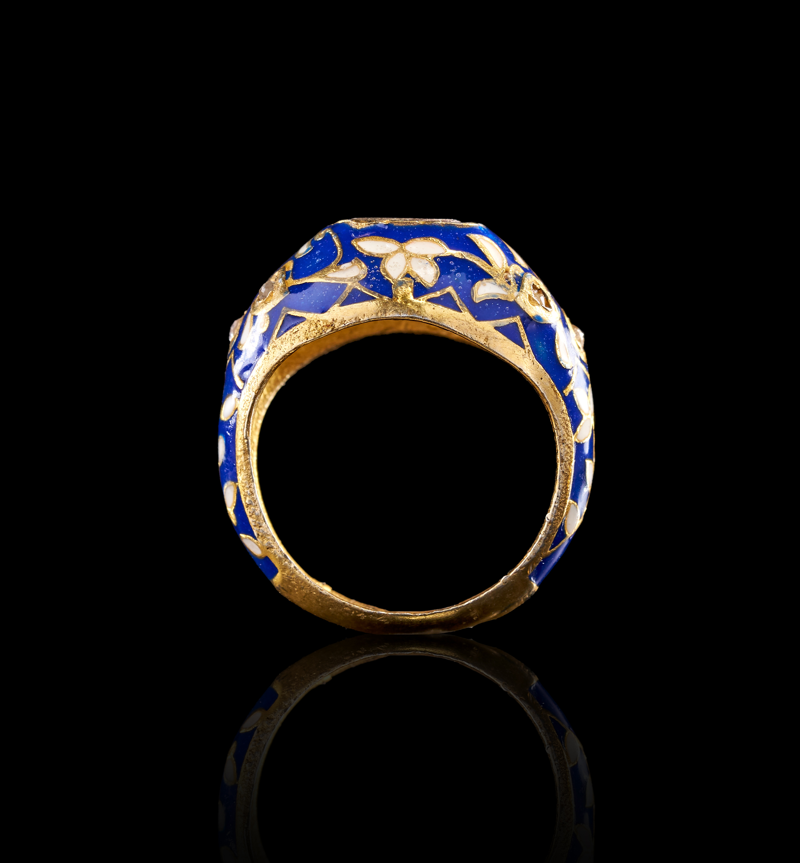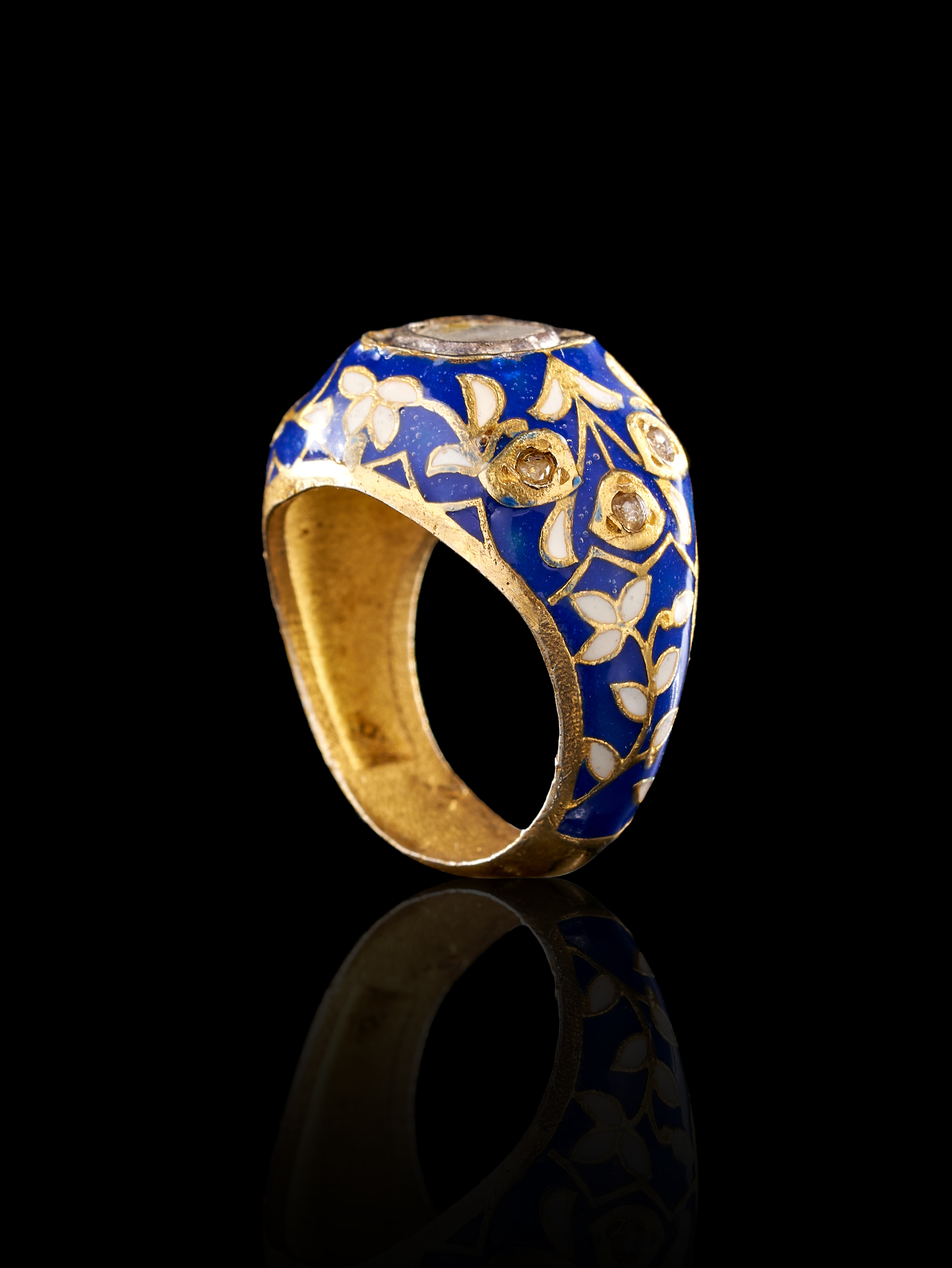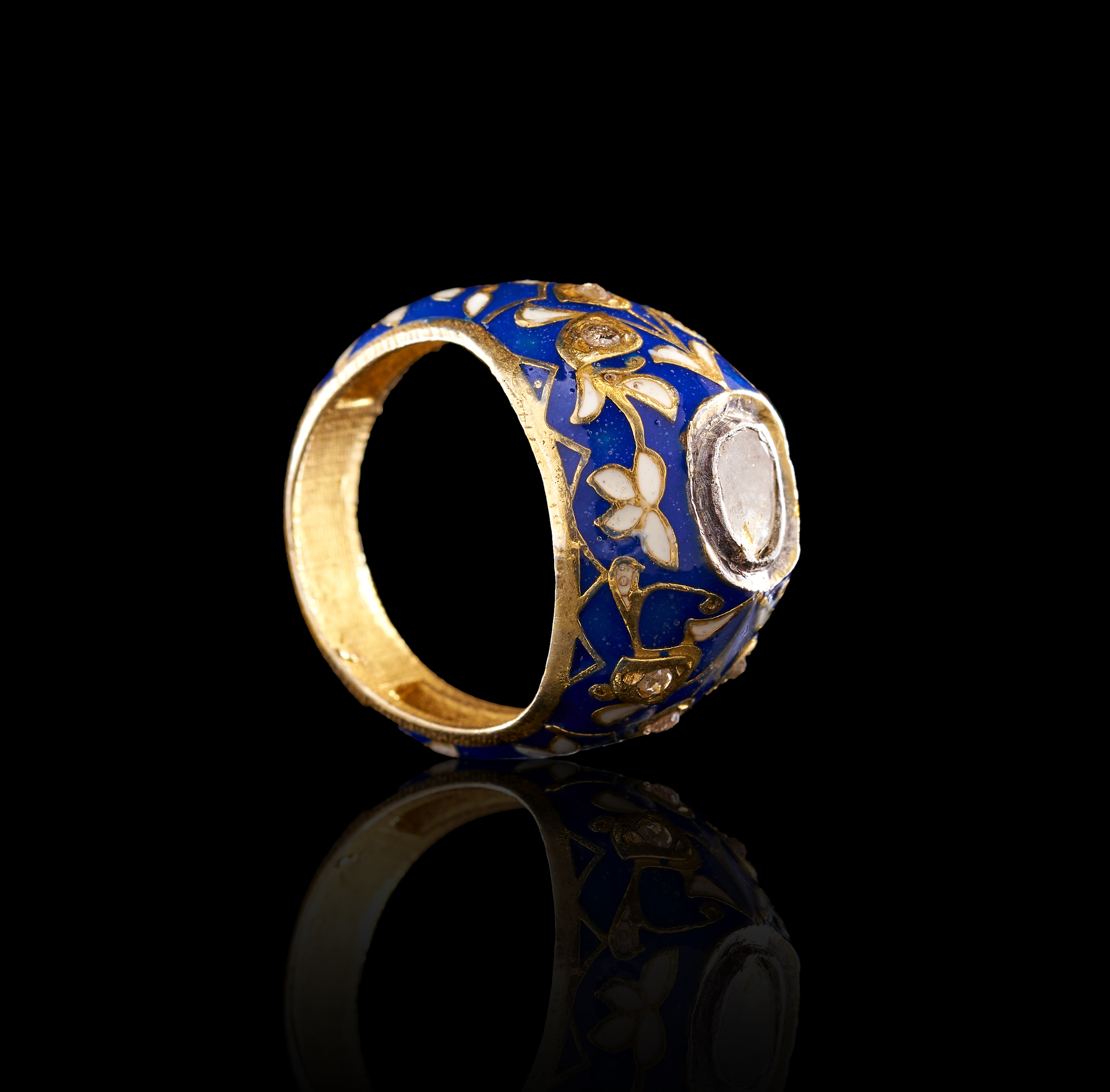 This Mughal style ring features traditional Meenakari enamel work. The wide, domed band is decorated with floral and foliate motifs in translucent blue and opaque white enamel. At the crown is a single, large, irregularly shaped polki diamond secured in a closed-back rub-over setting. The shoulders are accented with smaller inset colorless stones integrated into the enameled floral patterns. The interior of the ring shows a textured yellow metal finish.