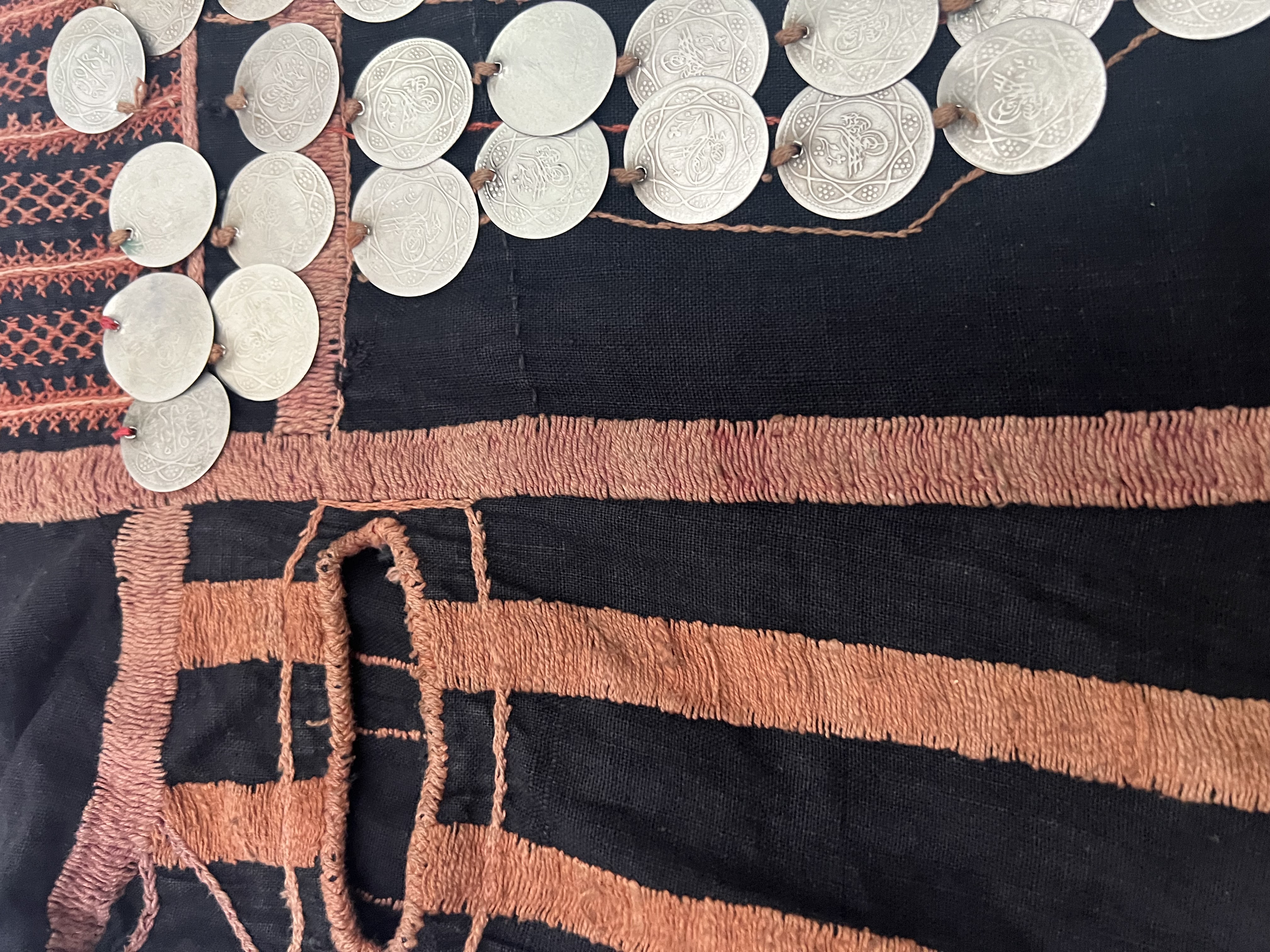 This traditional Palestinian or Syrian thobe is constructed from a black textile base featuring terracotta-colored applied bands and geometric hand-embroidery across the yoke, sleeves, and back. The garment is distinguished by a large, triangular bib-like arrangement on the chest composed of numerous silver-colored coins. These coins feature Ottoman-style tughras and Arabic inscriptions, with several specimens displaying the date AH 1327, corresponding to approximately 1909 CE. The embroidery patterns and construction techniques are characteristic of regional Palestinian textile traditions.