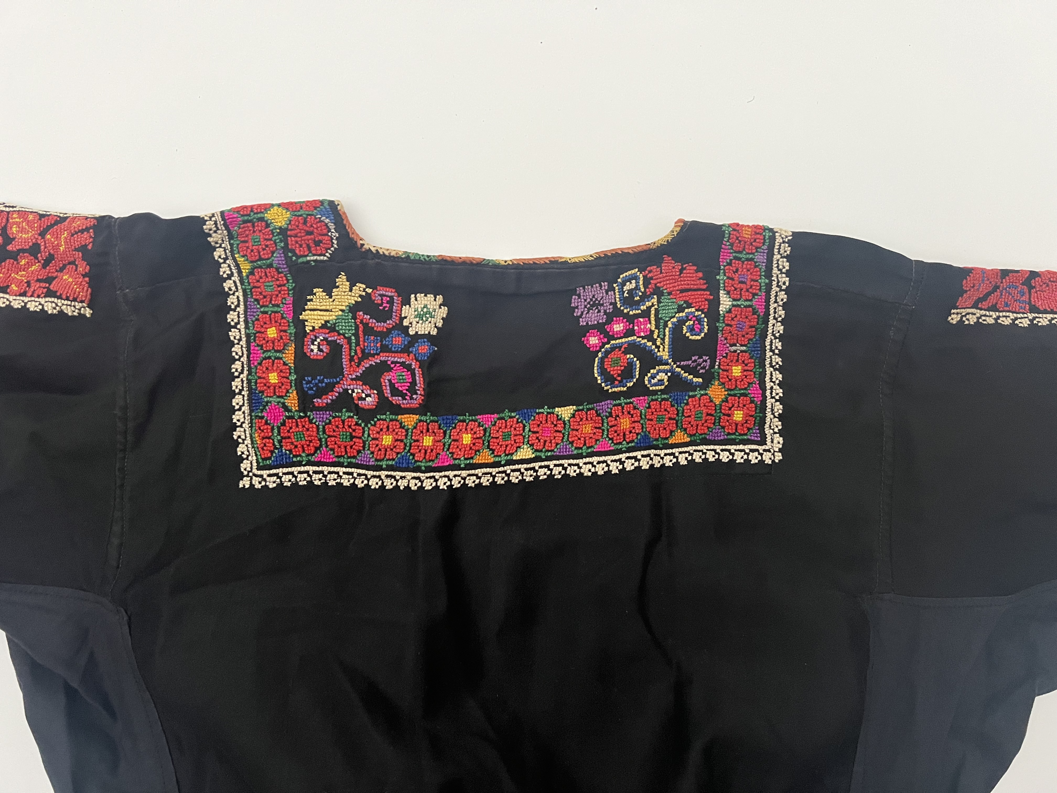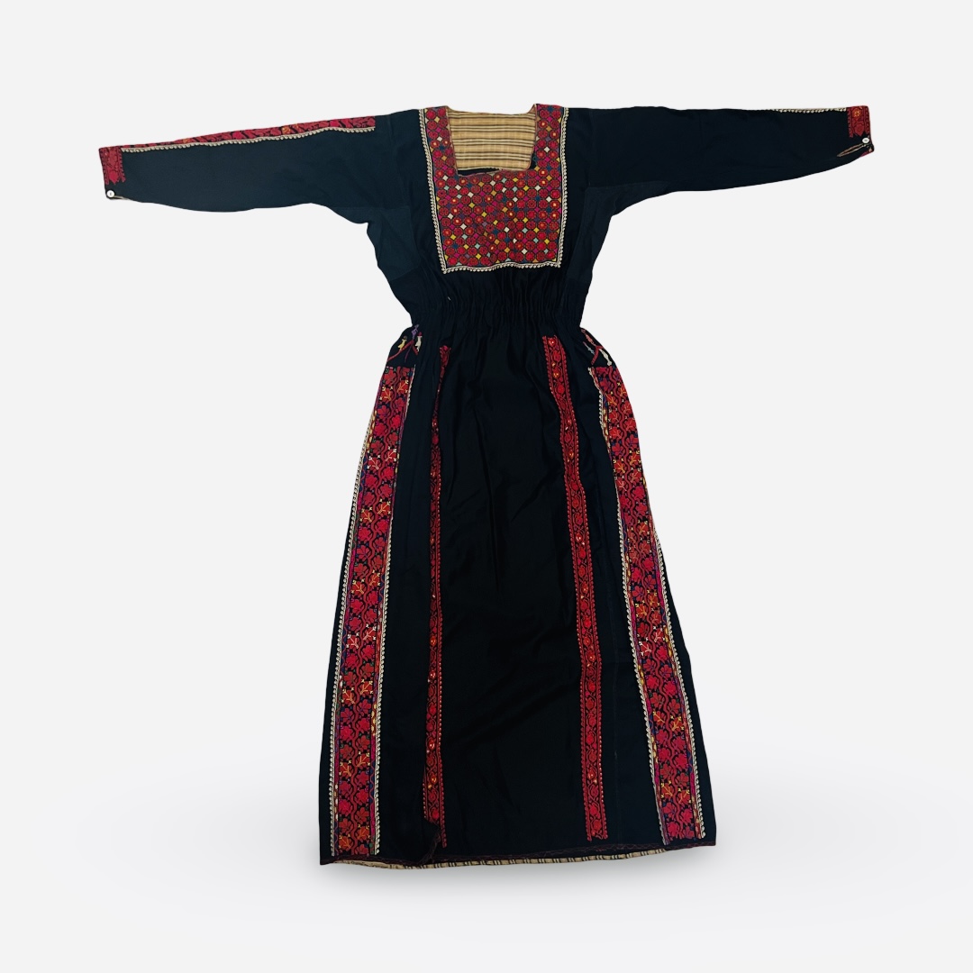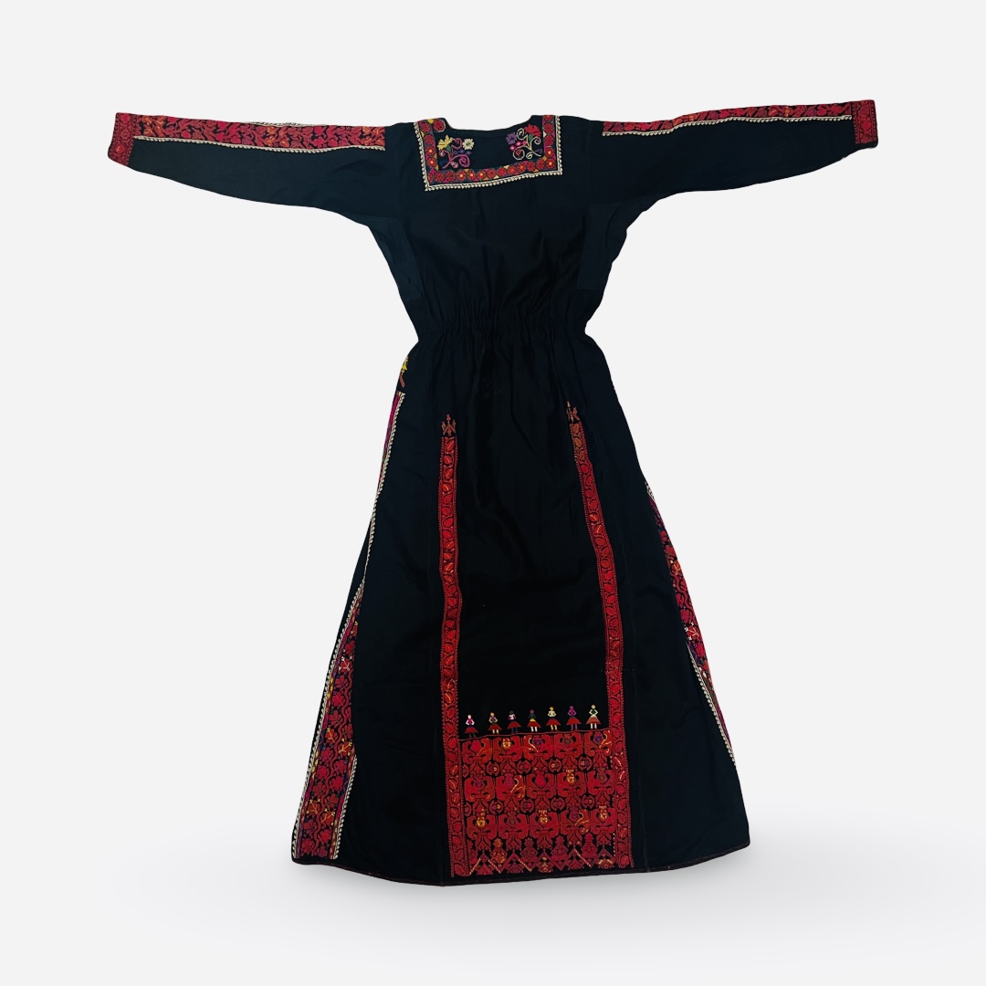 This traditional Palestinian thobe is an ankle-length garment constructed from a black fabric base. It features hand-embroidered tatreez cross-stitch decoration. The front includes a dense geometric chest panel known as a qabbeh and vertical decorative bands called banayeq on the skirt and sleeves. The lower back of the skirt contains a rectangular embroidery field known as a sheyal featuring traditional motifs and a row of stylized human figures. The embroidery is primarily red with accents in yellow, green, blue, and pink. The interior bodice is lined with a tan and black striped fabric.