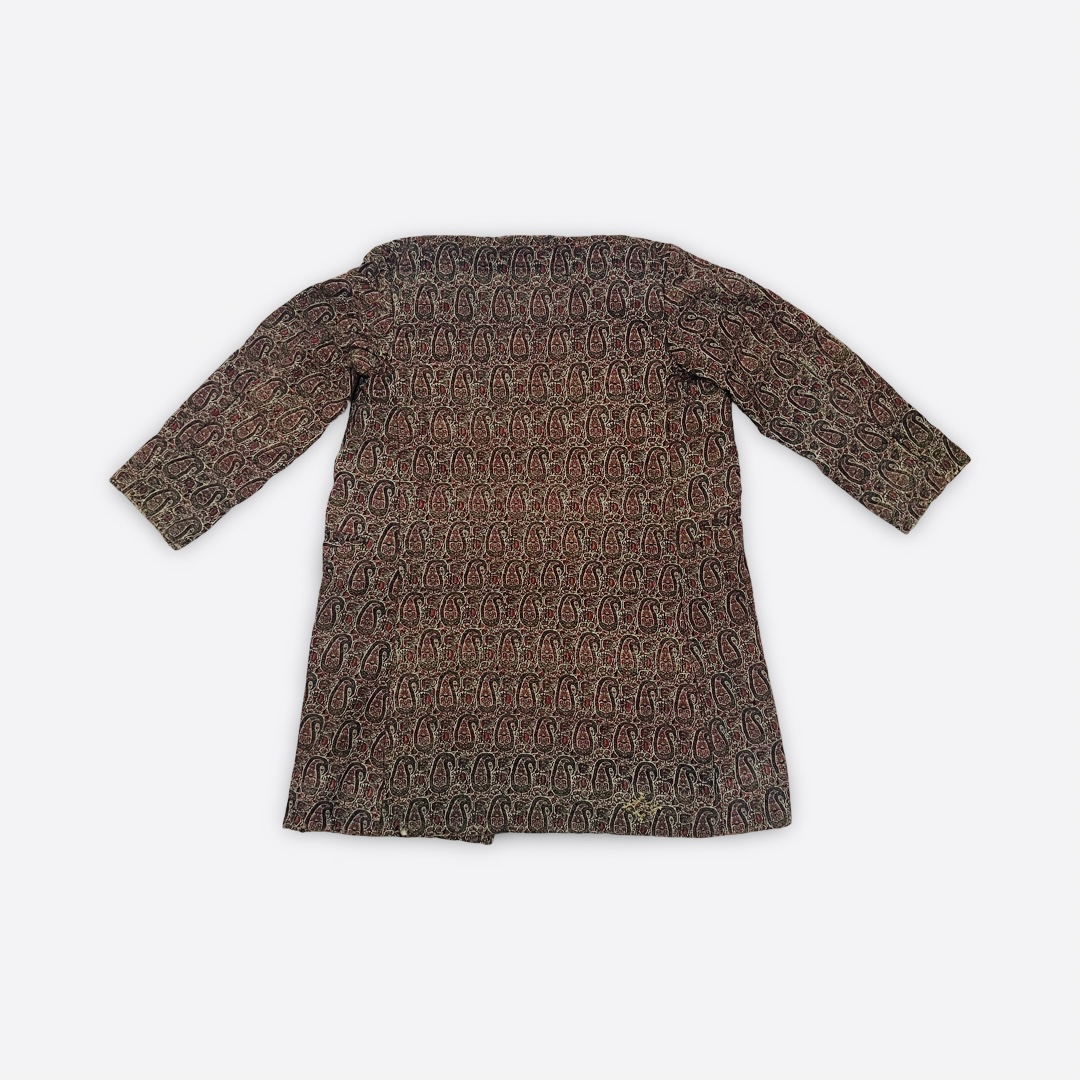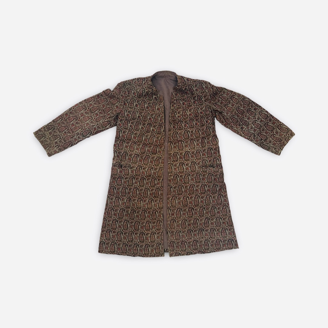 This long-sleeved, open-front robe is crafted in the Royal Qajar style from a dense, woven fabric. The textile features an all-over repeating paisley or boteh pattern rendered in a palette of deep red, forest green, black, and tan. The garment is designed with a slightly flared silhouette, a small standing collar, and two inset front pockets. The interior is finished with a plain, light-brown fabric lining. A small starburst motif embroidered in metallic gold thread is positioned near the bottom hem on the reverse.