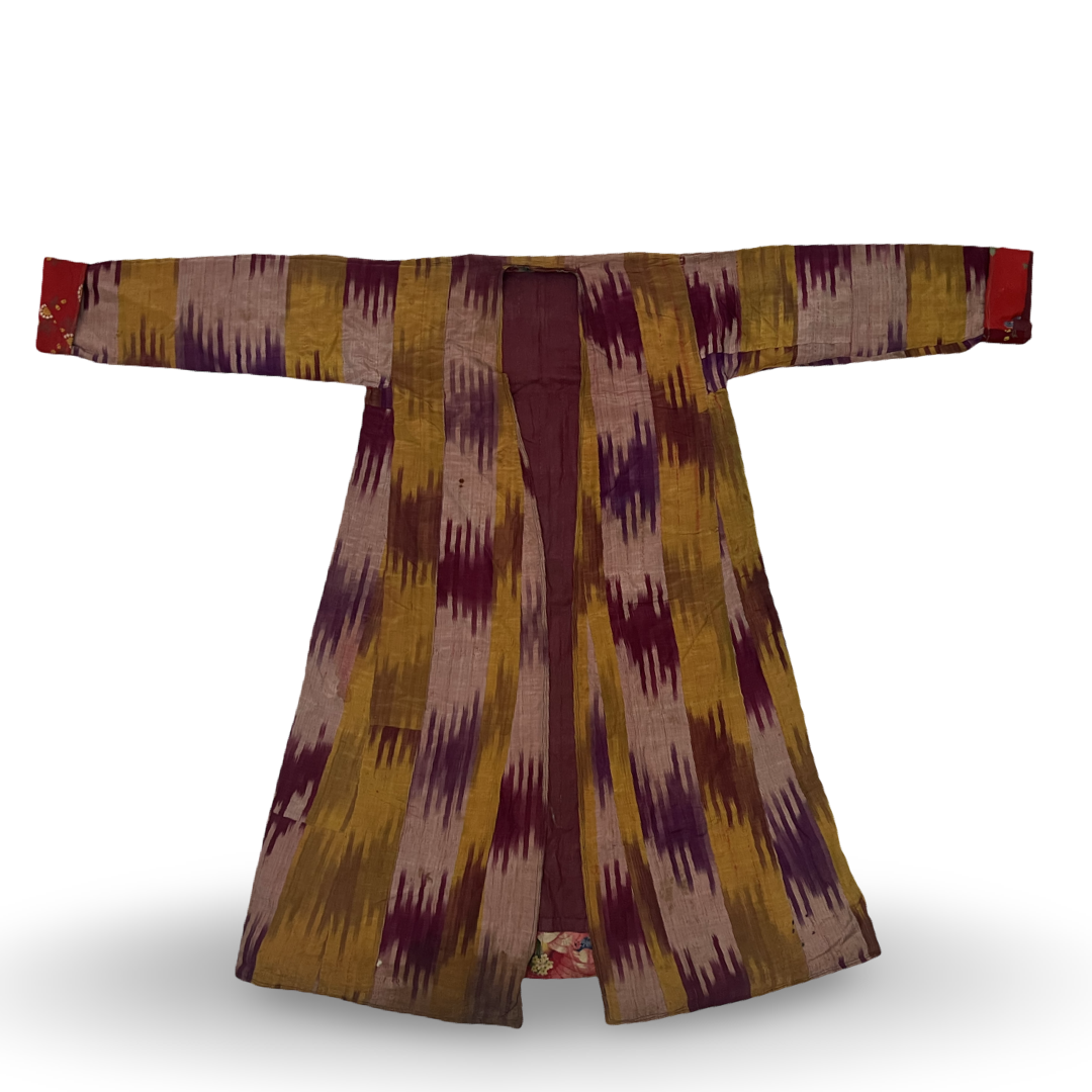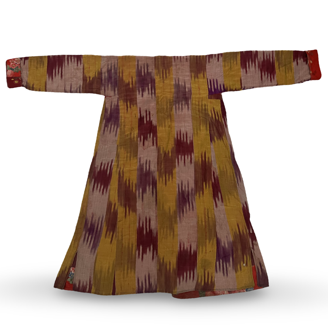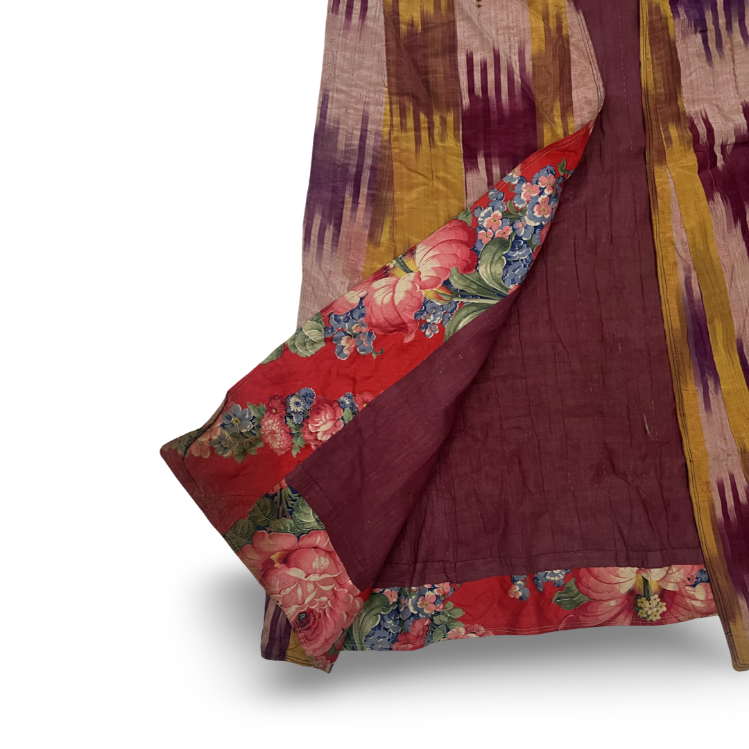 This Central Asian garment is constructed from hand-woven panels of ikat-dyed fabric, composed of silk or a silk-cotton blend. The exterior displays a vertical pattern of serrated stripes in shades of deep purple, maroon, ochre yellow, and pale lilac. The robe is designed with an open front and long, straight sleeves. The interior is fully lined with a solid maroon fabric, while the cuffs and hem are finished with a contrasting red printed cotton trim featuring a floral pattern of roses and smaller blossoms.