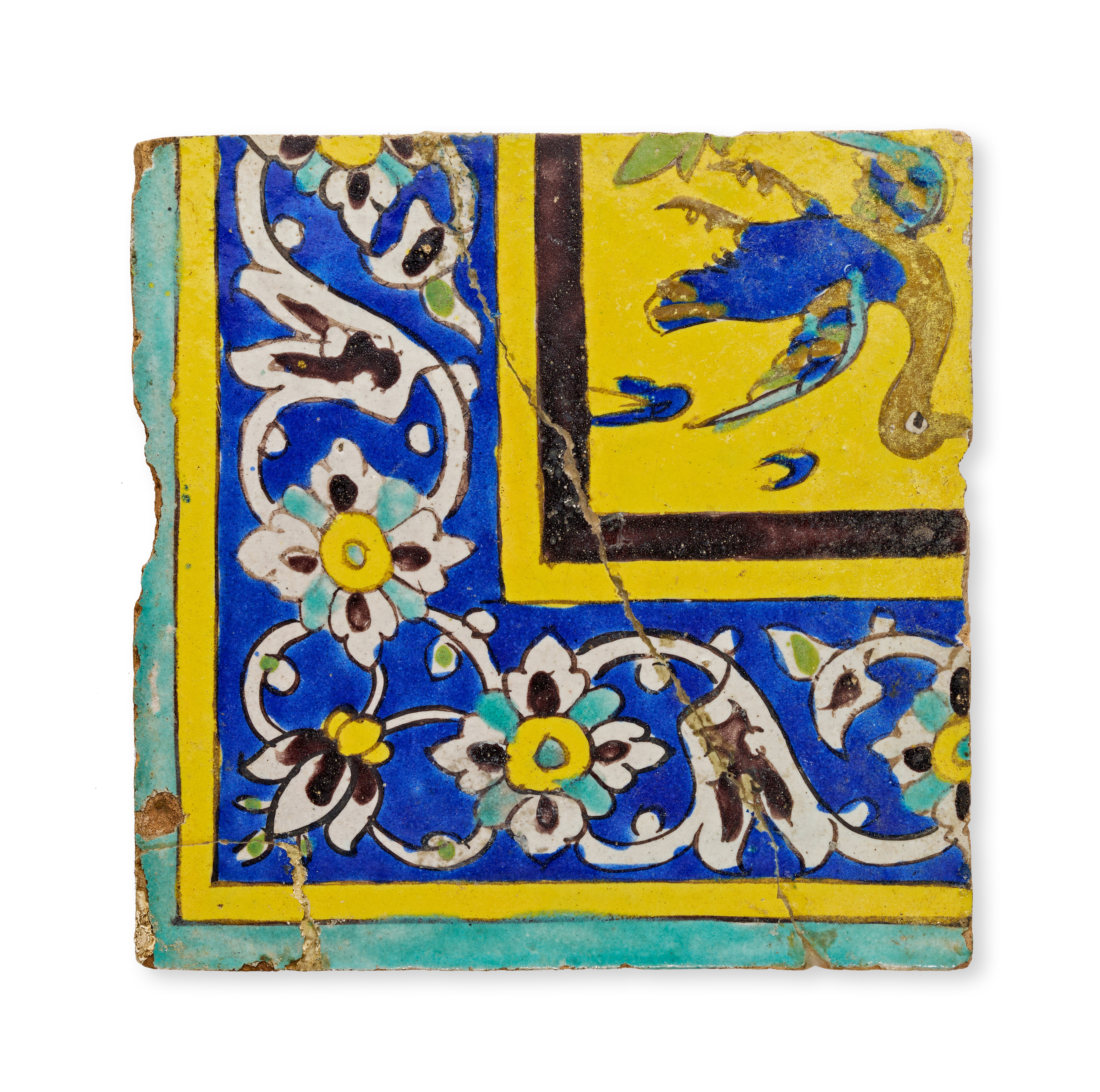 This square pottery tile is executed in the cuerda seca technique, characteristic of the Safavid period. The composition features a yellow field depicting a blue bird in flight, enclosed within a cobalt blue border. The border is decorated with scrolling white and yellow floral arabesques. The reverse of the tile reveals a coarse, reddish-brown terracotta body with visible white mortar residues and a diagonal groove from its original architectural setting.