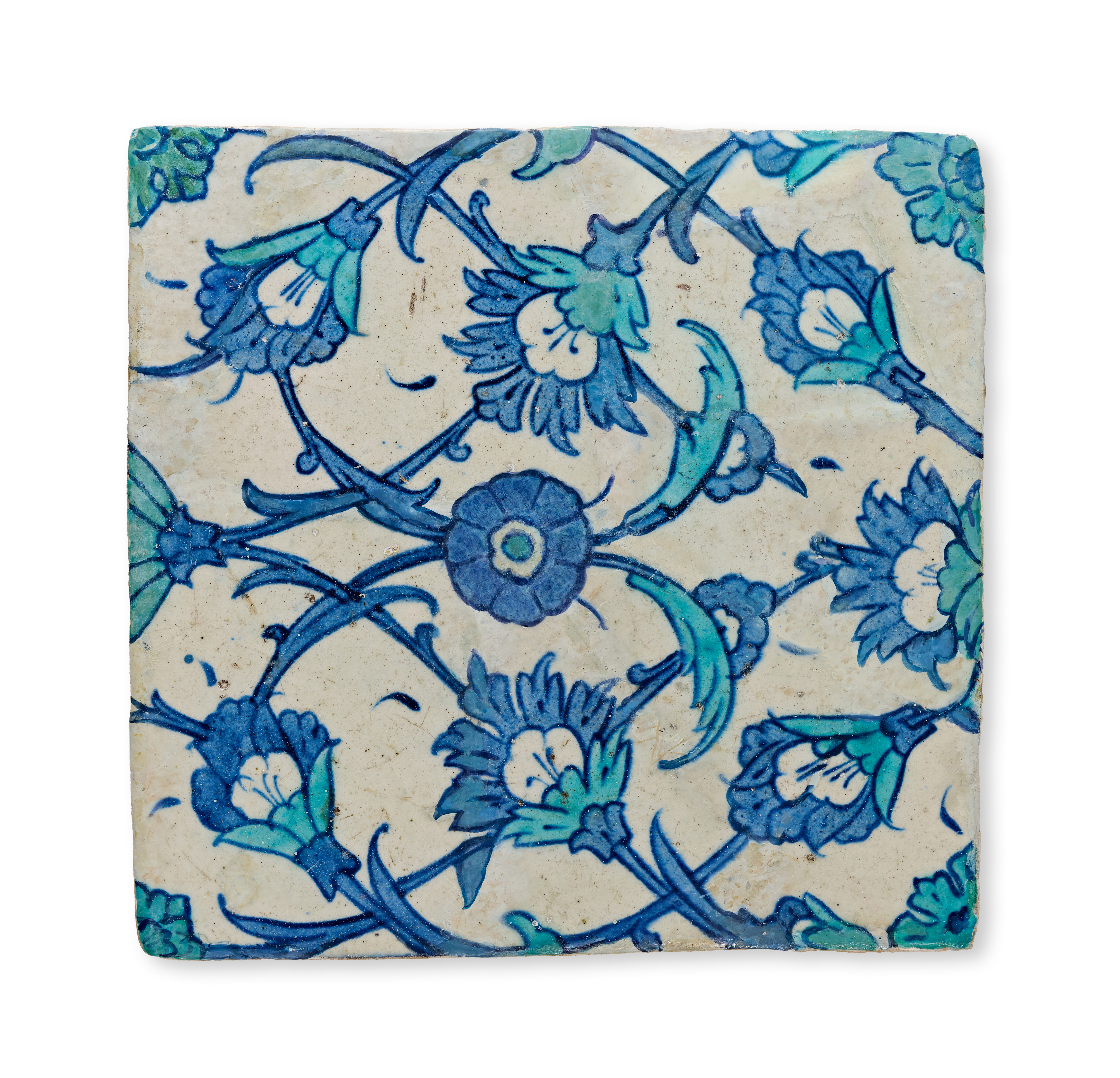 This Iznik pottery tile is of square form and features a glazed surface over a buff-colored ceramic body. The symmetrical floral arabesque decoration is rendered in shades of cobalt blue and turquoise against a white ground. The composition is centered on a floral boss within a lattice of scrolling vines, serrated saz leaves, and stylized flower heads. The reverse of the tile is unglazed, revealing the buff-colored ceramic body with characteristic surface irregularities.