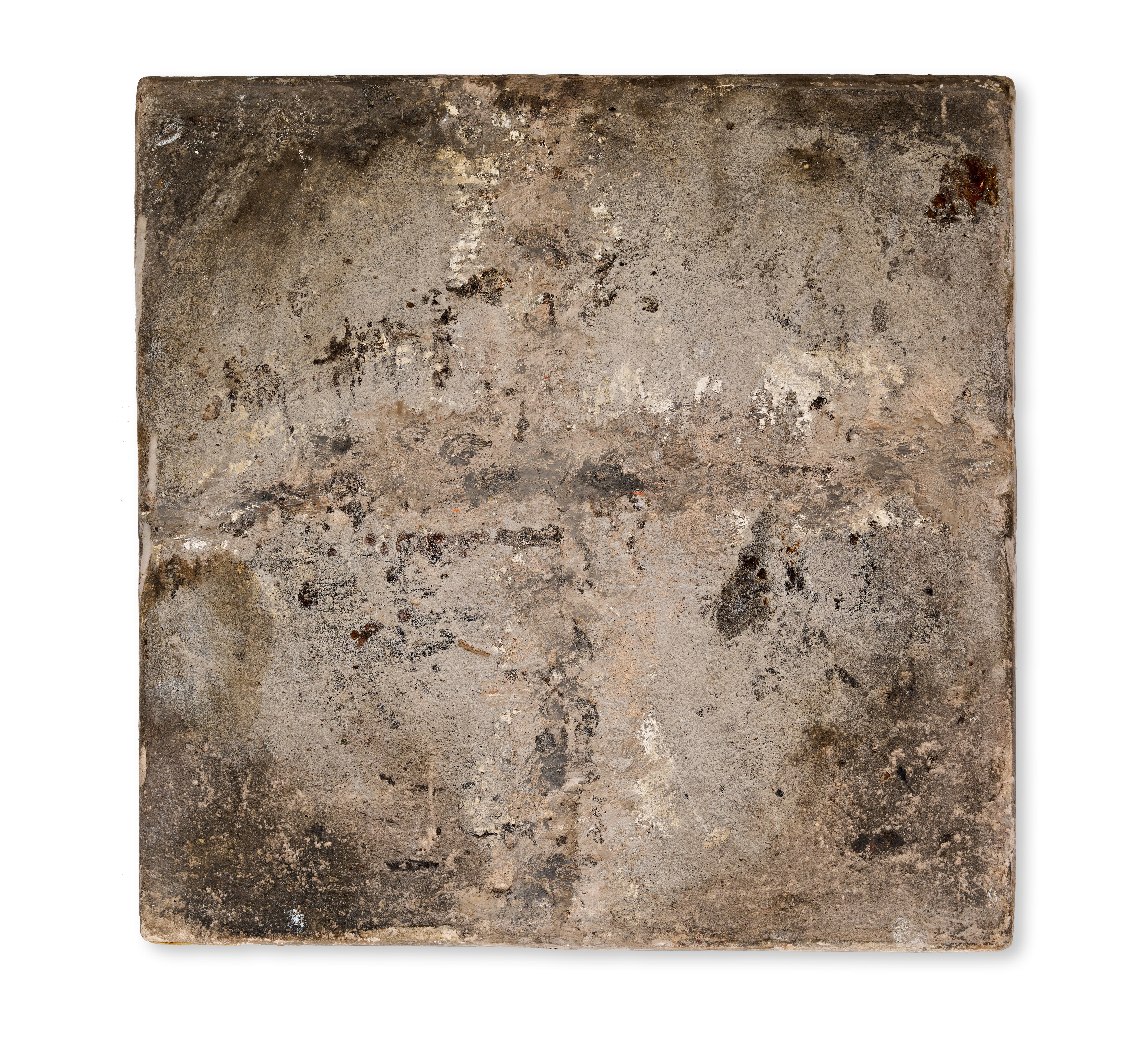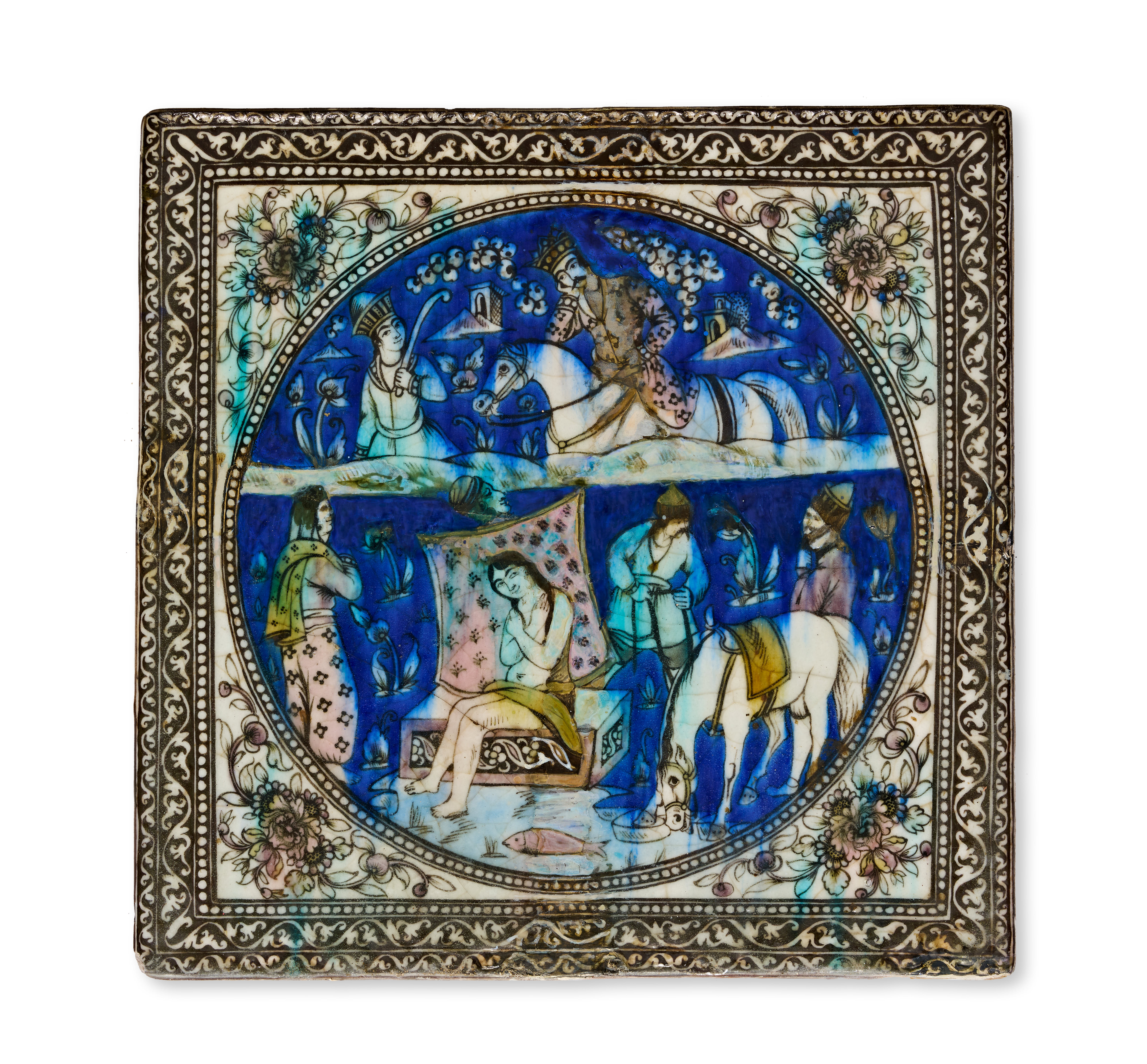 This Qajar molded pottery tile from 19th-century Persia features a central circular medallion depicting the classical literary scene of Khusrau visiting Shirin. The composition is divided horizontally: the upper section shows a royal figure on horseback with an attendant, while the lower section depicts a partially-clad female figure seated by a stream with a fish, surrounded by attendants and a grazing horse. The scene is set against a vibrant cobalt blue ground and is framed by floral spandrels and an outer border of black-and-white scrolling vines. The tile is executed using the cuerda seca technique with polychrome glazes in shades of turquoise, pink, yellow, and manganese. The unglazed reverse shows a rough, grayish body with remnants of mortar.