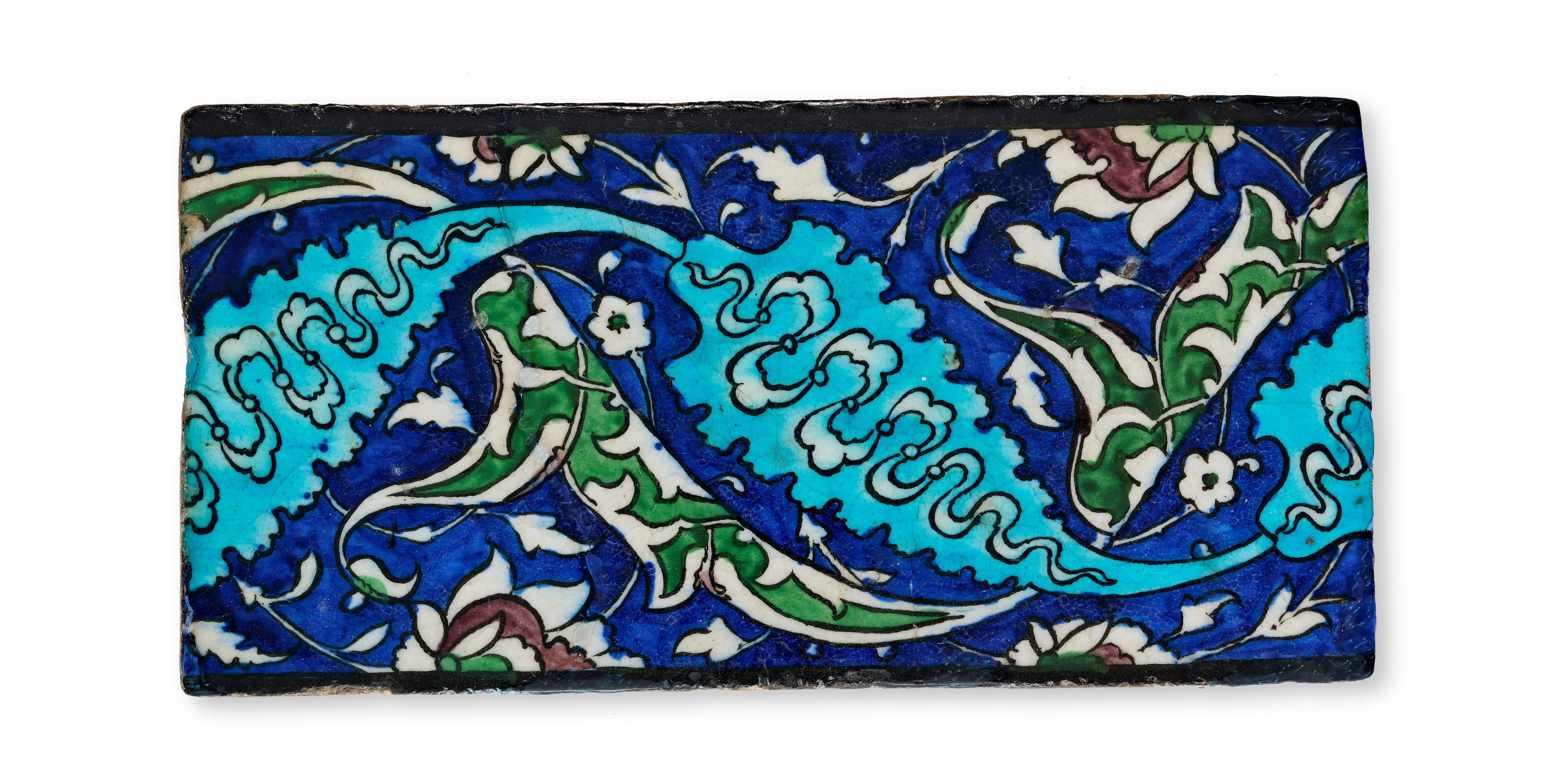 A Damascus underglaze-painted pottery border tile of rectangular form, dating to the late 16th century. The fritware body is decorated with large, serrated saz leaves intertwined with floral sprays and scrolling vines. The design is executed in a palette of cobalt blue, turquoise, sage green, and white against a rich cobalt blue ground. The composition is framed by thin black borders along the top and bottom edges. The reverse remains unglazed, showing a characteristic buff-colored ceramic body.